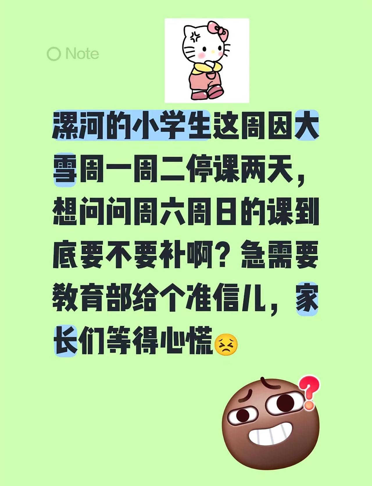 补不补到底。漯河的小学生这周因大雪周一周二停课两天,想问问周六周日的课到底要不要补啊?急需要教育部给个准信儿,家长们等得心慌😣教育局最新通知 雪休通知