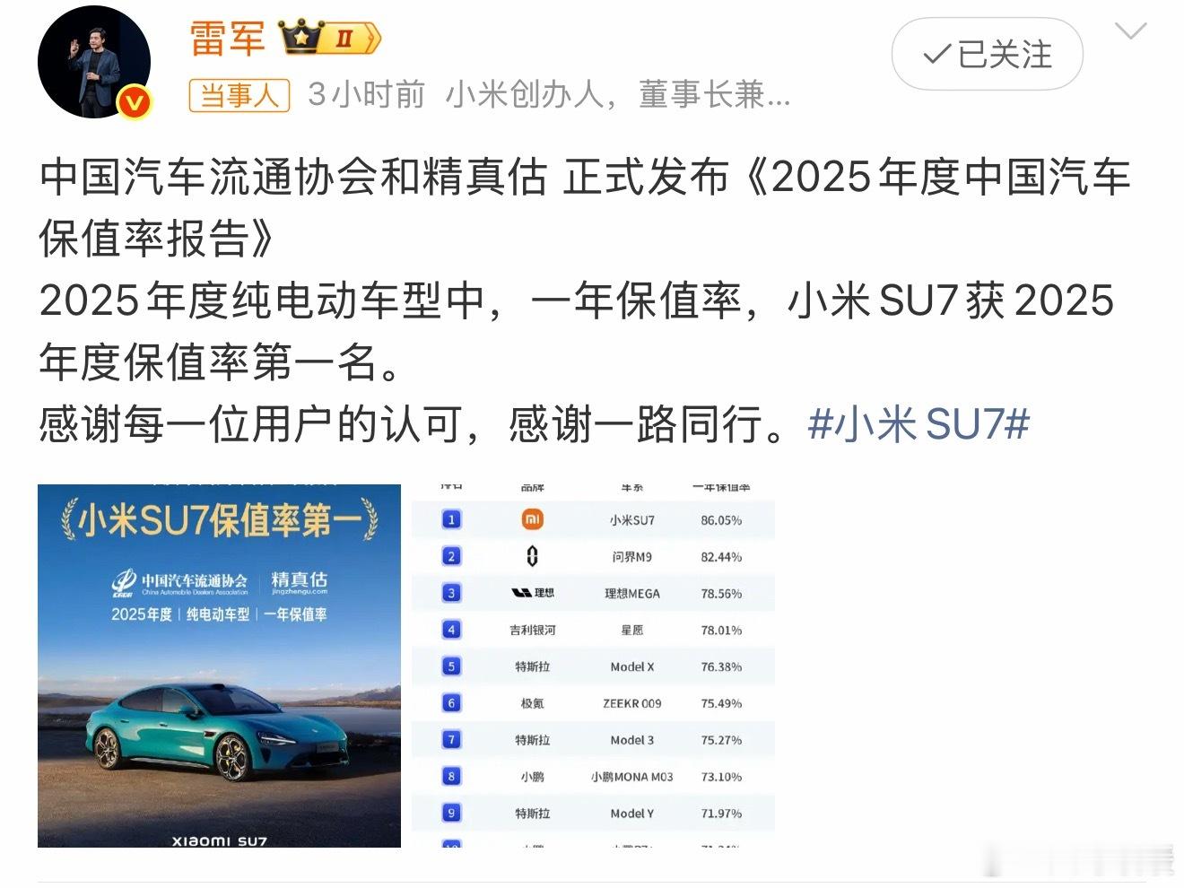 小米SU7保值率第一名确实没得说,首款车能做到这地步是真挺牛的雷军回应小米SU7保值率第一名