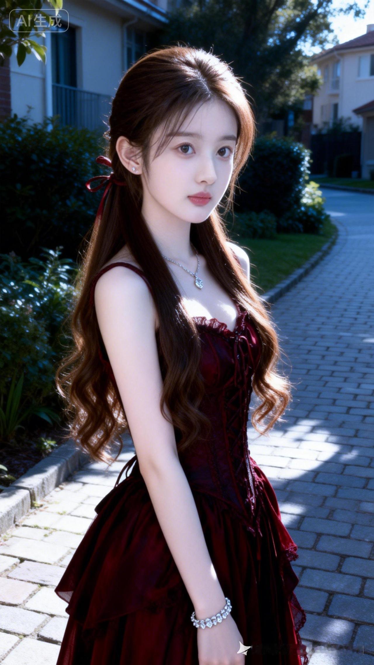 冰瓷玉肌冷白皮瓜子脸美人,茶棕直卷发系带蓬松垂肩,深红哥特裙配精致首饰,小区石砖路绿植背景,侧光发丝光斑驳,高曝光强对比,纯真情切,氛围感拉满。