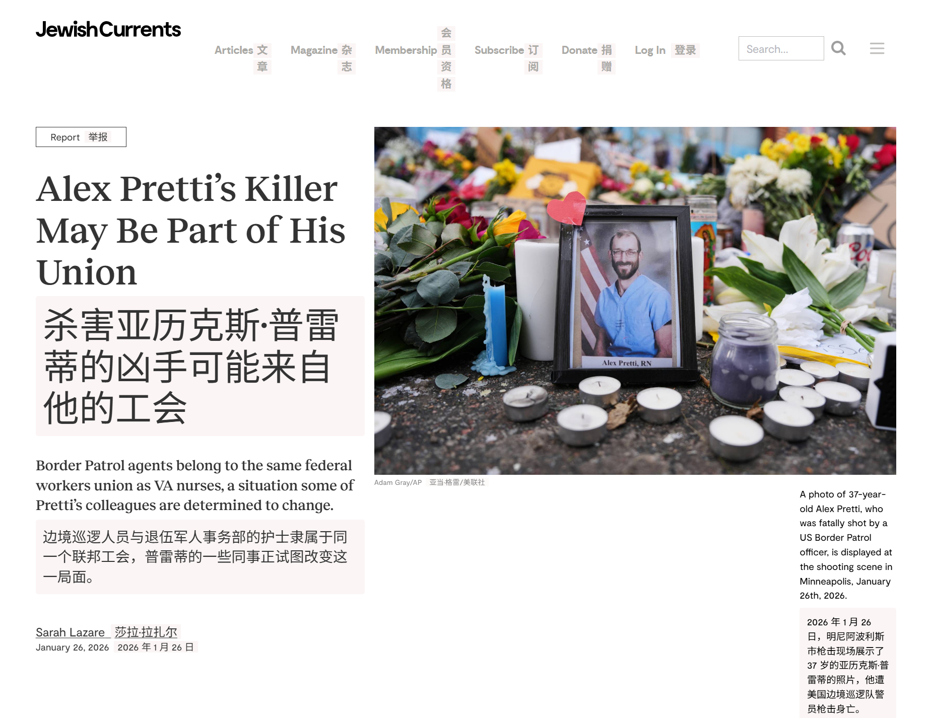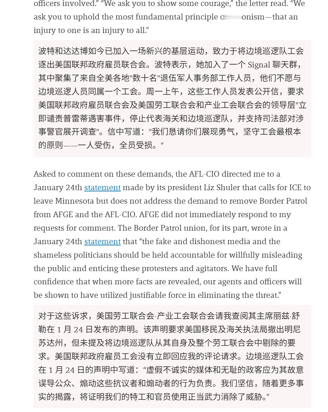 🔻美国媒体报道:杀害亚历克斯·普雷蒂的ICE探员,可能与亚历克斯·普雷蒂同属一个工会——美国政府雇员联合会。🔻一些美国退伍军人事务部的员工正在推动美国政府雇员联合会将移民和海关执法局、边境巡逻队雇员逐出联合会。🔻这也是个犹太媒体Jewish Currents特朗普称正审查ICE枪杀美公民事件牢a谈美国ice暴力执法争议热点现场海外新鲜事