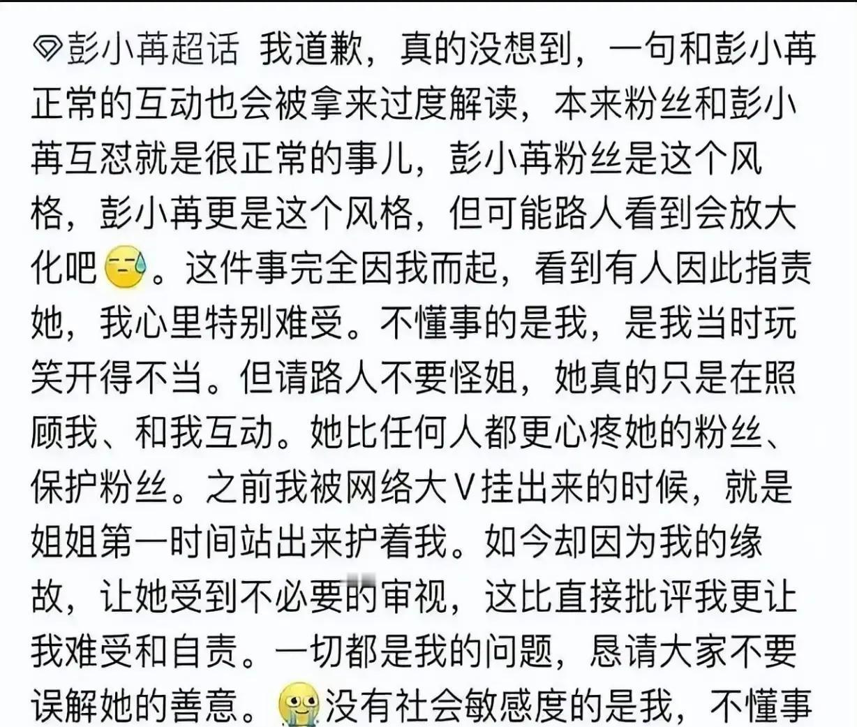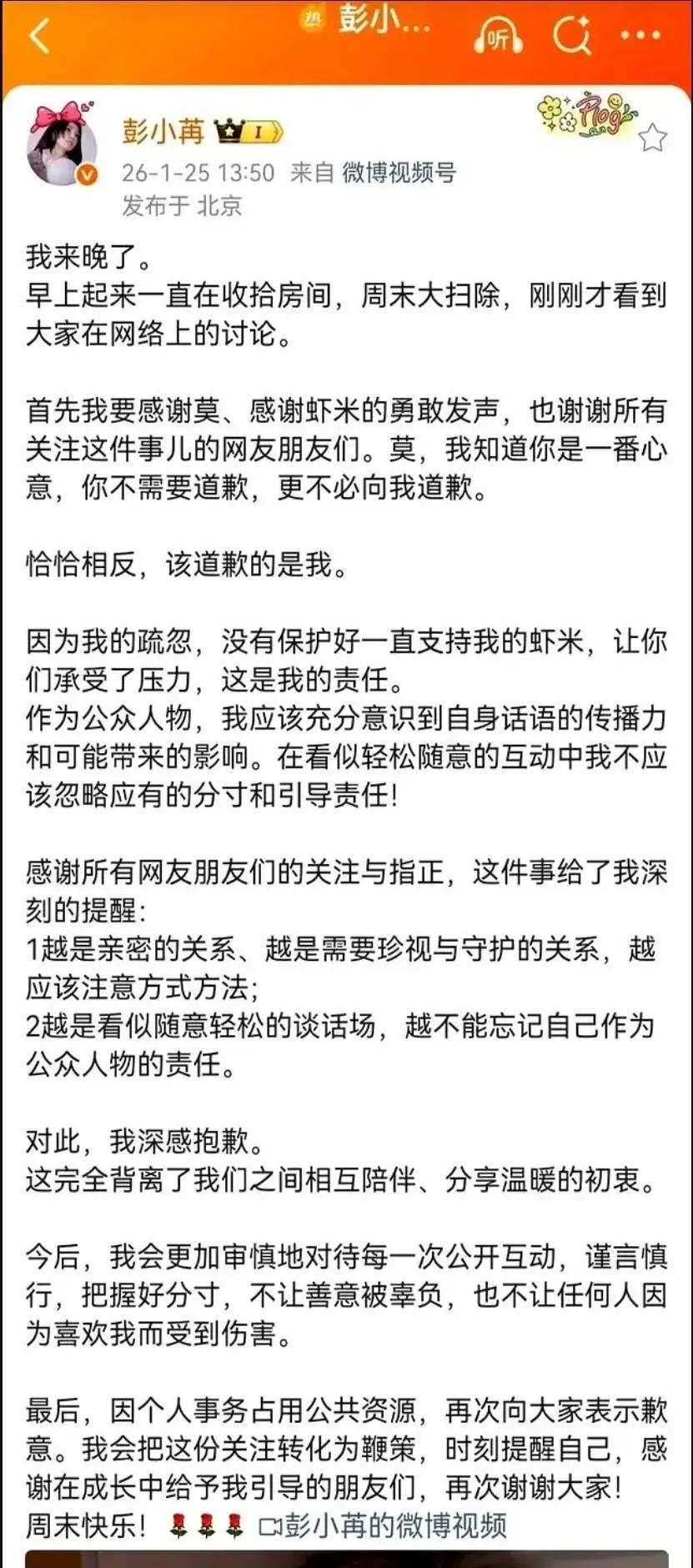 1月24日晚,演员彭小苒在社交平台回复一位老粉丝的留言,直接回了句“祝你天天加班”,本是两人之间熟悉的调侃梗,谁知截图一传开,瞬间冲上热搜,很多人觉得这句话戳中了打工人的痛点,毕竟现在加班文化太普遍,好多人天天累到崩溃,看到明星这么回难免不舒服。 第二天25日,彭小苒就拍了道歉视频,素颜出镜,说自己作为公众人物,说话得注意分寸和影响力,这次互动太随意,没考虑到会被放大,错了的就是自己,以后会更小心谨慎对待每一次公开回复。她特别提到,不想让任何人因为自己的话受伤,也感谢大家指正。 这件事其实挺典型的,明星和粉丝平时玩得开,熟了就爱开玩笑,但网络时代传出去,语境容易丢,很多人带着自己的情绪去解读,就炸了锅。加班这事本来就敏感,全网数据超七成打工人讨厌加班,压力大到影响健康和生活,明星一不小心就踩雷。 彭小苒反应快,道歉态度诚恳,也算及时止损。明星想保持亲和接地气没错,但公众人物的每句话都带着放大镜,得掂量好轻重。粉丝也别太玻璃心,理解彼此边界才长久。希望以后大家互动都能多点体谅,少点误会