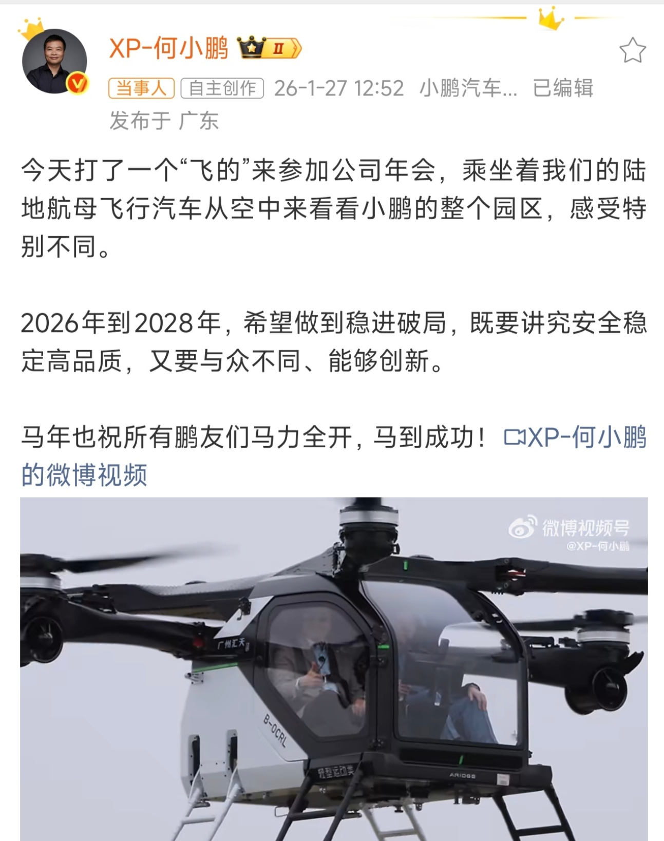 何小鹏坐飞行汽车降落年会现场 坐自家飞行汽车去参加年会,真的是科幻片照进现实!从概念车到量产,这么快,未来离我们真的不远了。虽然目前飞行汽车还属于少数人体验,但新技术的诞生往往都是从少数到普及的。想象一下,哪天打“飞的”上班像打车一样方便,生活的画面就全都变了!现在虽然还只是个小众体验,但能看到它一步步推进,真的给了我更多信心,很多曾经觉得遥远的事,正变成现实。飞行汽车从概念到量产,技术演进的速度比我想象的快,未来的出行方式,真的是很值得期待!