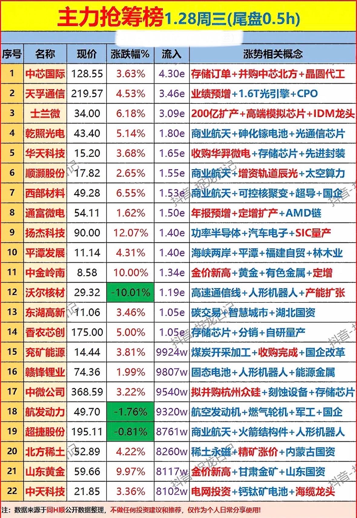 主力抢筹榜1.28周三(尾盘0.5h),带你解读涨势概念股! "半导体龙头抢筹榜出炉!中芯领衔存储芯片,士兰微扩产IDM,通富绑定AMD链,黄金稀土齐飞,航天军工暗藏机会~"