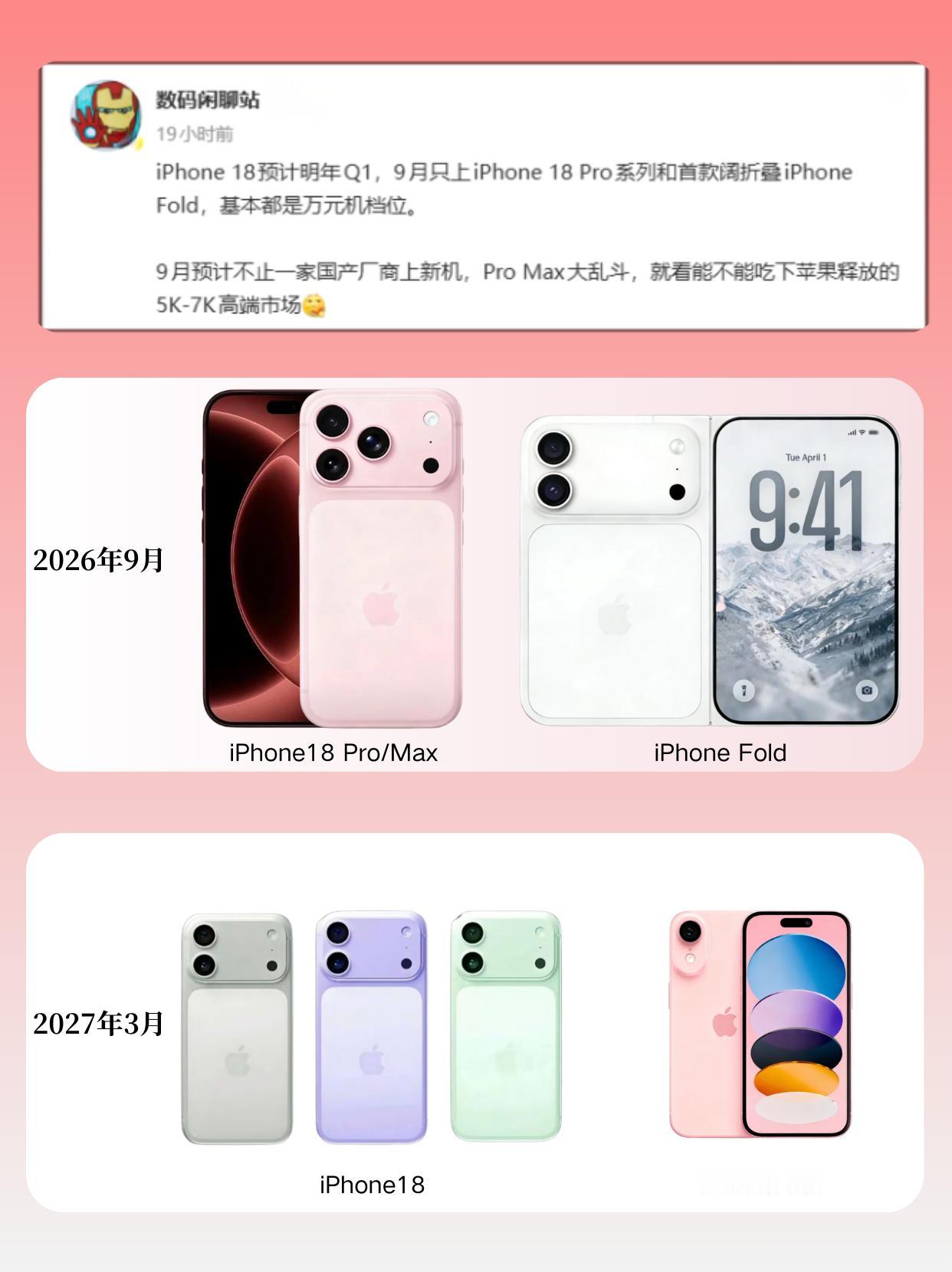 明年见咯iPhone18,iPhone17成最大赢家 从18开始,苹果要打破了一年一更的传统了,今年9月只发更贵的 Pro系列和折叠屏,而标准版 iPhone 18 要等到明年春季,和传言中的iPhone 18e再一起发 通过更精细的“档期”和“刀法”来全年覆盖不同价格区间的用户,今年空出的档期就只能先由iPhone17顶着了,怪不得今年给iPhone17加上高刷了,反正iPhone17用户赢麻了 不过果子这招也有风险,国产机型可能趁这个窗口期,争取到一部分iPhone用户,你觉得国产旗舰能抓住这次机会吗? iPhone18标准版或明年发布 iPhone18 iPhone 红薯地新鲜事 @热点薯