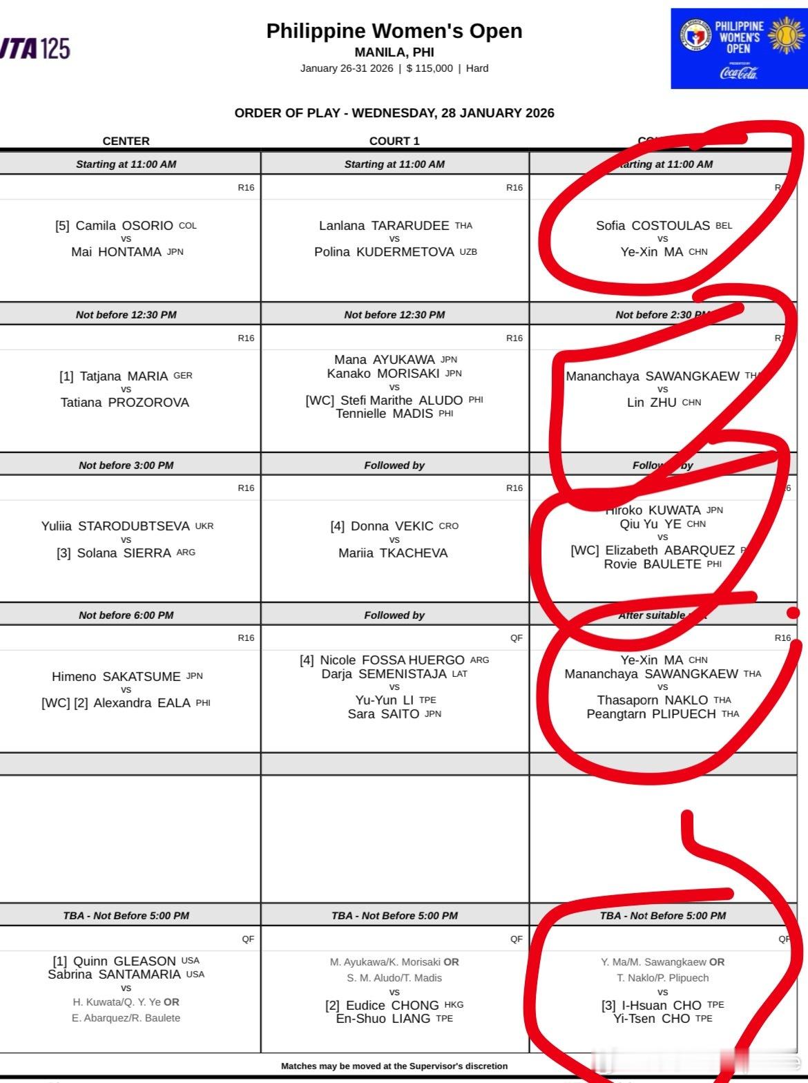 刚刚有人问我咋看 朱琳的比赛。马尼拉这站WTA125 一共三个比赛球场 在官网 两个球场有直播信号 中心球场、1 号球场 今天的赛程 把中国网协球员全部塞进2 号球场, 也可以说2号球场都是中国球员比赛并且没有官方信号所以我也不知道咋看了这很澳网