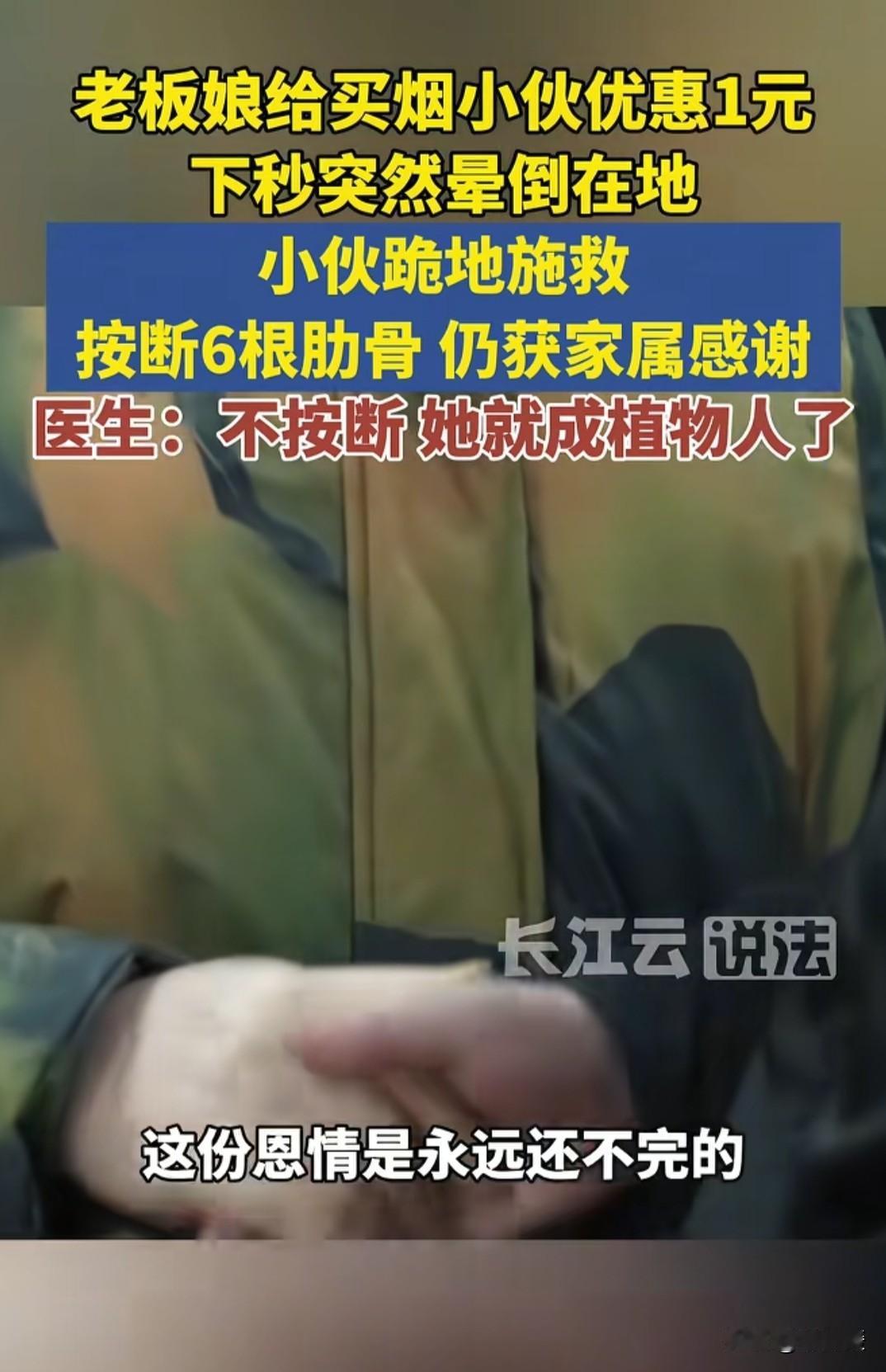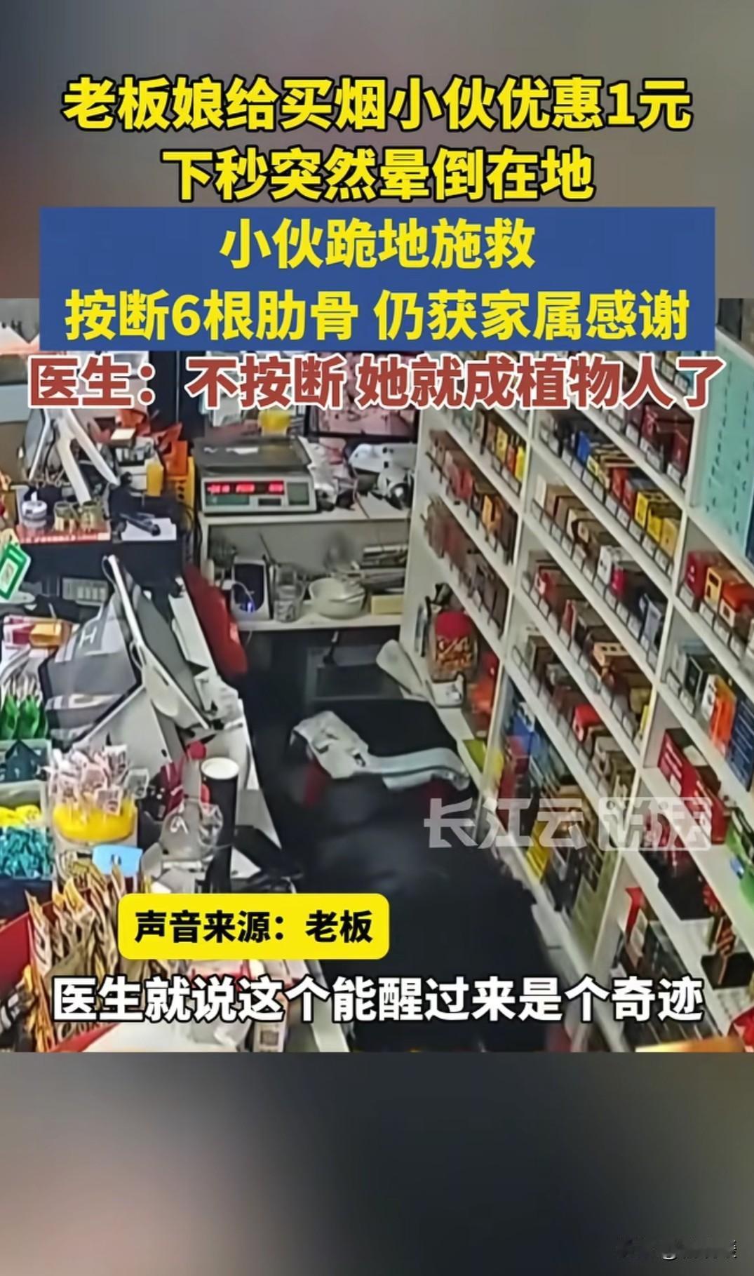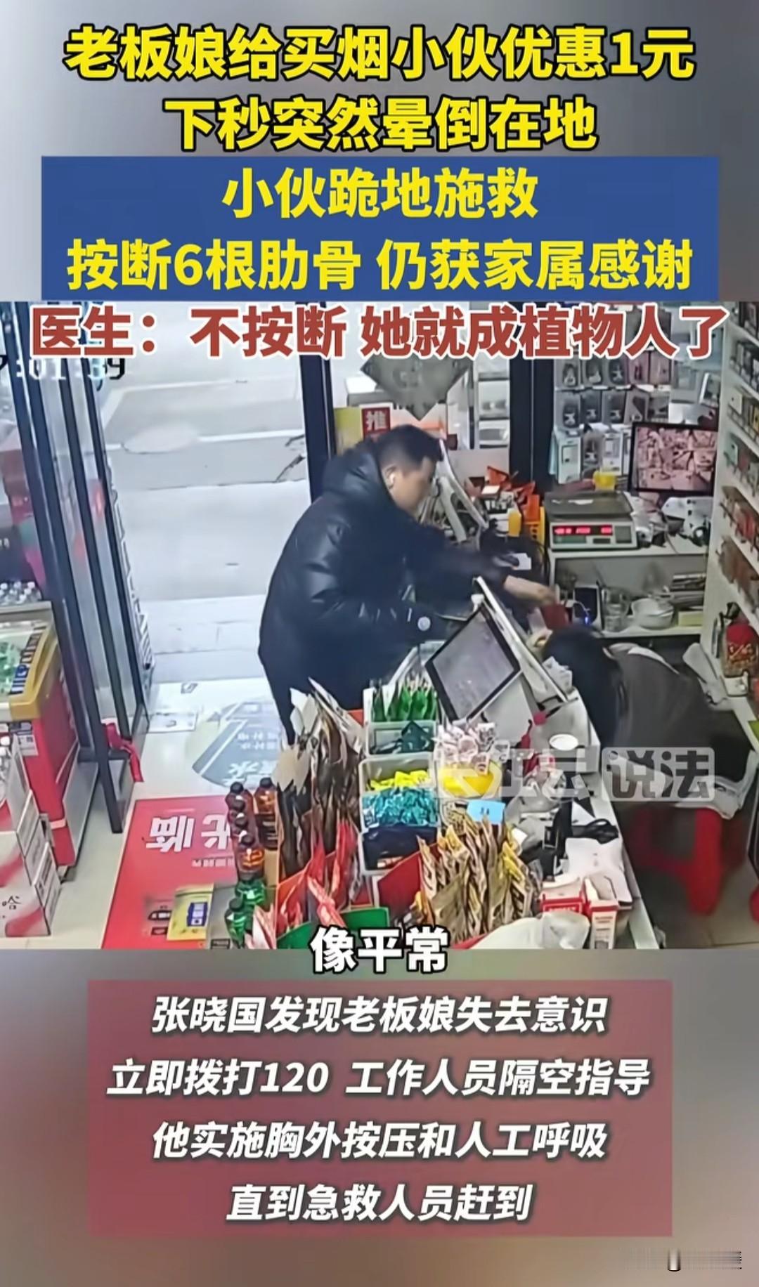 “1块钱换来一条命,太值了!”河南人张晓国在苏州吴江区一家工厂打工,和往常一样,2025年年底的一天,他又来到工厂对面的超市购物,费用是191元,按照惯例,他直接就扫码付款,拿东西走人了。 可那一天却偏偏不一样,老板娘对他说:“1块钱就算了,付190元就可以了。” 正是这优惠的1块钱,让他多停留了一会儿,和老板娘闲聊了几句,然后他才拿起手机付款,就在这时,老板娘却趴在了收银台上,身体慢慢地往地上滑,张晓国反应过来,伸手去拉,没有拉住,老板娘已经倒在了地上。 他下意识地走向超市里面喊老板,无人应答,因为他没有急救方面的知识和能力,所以赶紧拨通了120,接线员从他这里了解情况后,确定老板娘属于无效呼吸,黄金抢救时间只有4分钟。 按照接线员的指示,张晓国给老板娘做了600次胸外按压,尽管两条胳膊已经酸痛僵硬得不行,他也不敢停歇。 尽管这样,老板娘还是没反应,张晓国又按照指示,给老板娘做了人工呼吸两次,胸外按压100次,重复了两组后,老板娘嘴巴微张,重复三组后,急救人员接替了他的工作,然后把老板娘送进了附近的医院。 经过抢救,老板娘已经顺利出院,不过她只记得以前的事,对现在的事没有一点记忆。 而对于老板,事发当天就给救命恩人张晓国又是打电话,又是加微信,满是感激,虽然张晓国按断了他妻子的6根肋骨,他却说:“按得好!”要不然,他和妻子就得天人永隔了,好一点,就算抢救过来也是植物人了。 “好人有好报!”张晓国被颁发了见义勇为奖。 张晓国说当时他对老板娘进行急救后,他还是有点后怕的,万一老板娘没有被抢救过来,到时候她的家人讹上他怎么办?所以他又报了警,在那里备了案。 “时也,命也!”一切都是最好的安排,老板娘因为给老顾客优惠了一块钱,多争取了对方停留的时间,而对方本质也是一个心地善良的人,愿意冒险去救人。