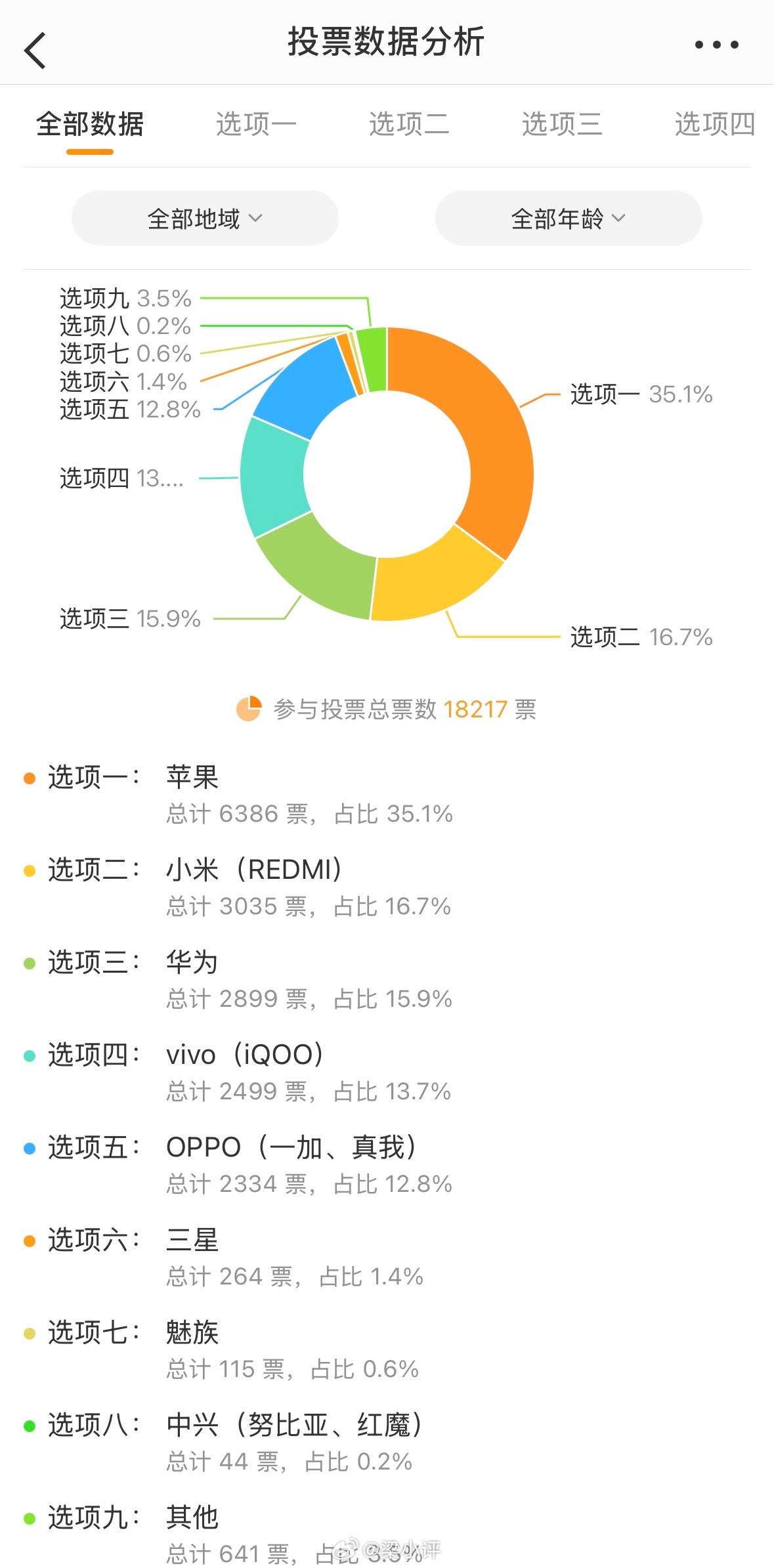 【正在用的手机是哪个品牌?最多选3个】1.5万人参与,总共18217票。没想到用苹果手机的人数占比高达35.1%,6386张票