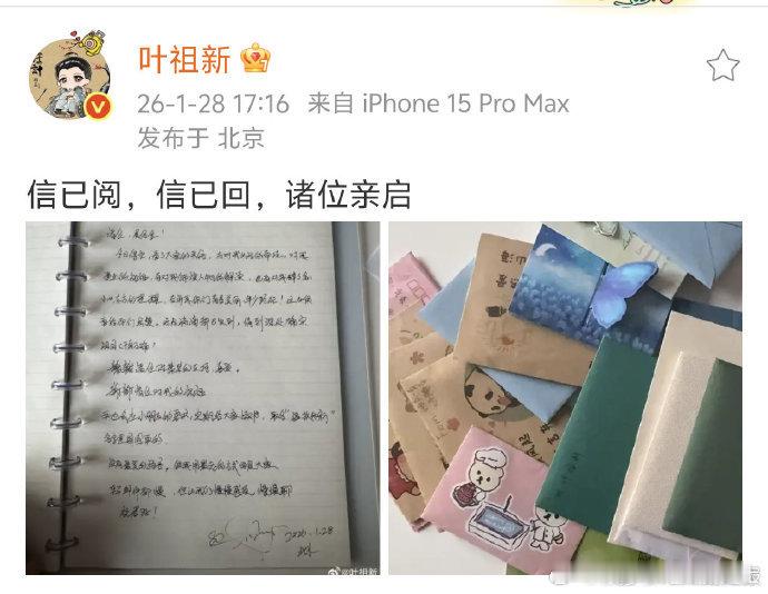 叶祖新手写信回复粉丝叶祖新回复粉丝的信 叶祖新用手写信回复粉丝,这封回复信里满是