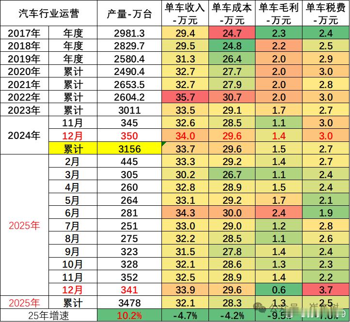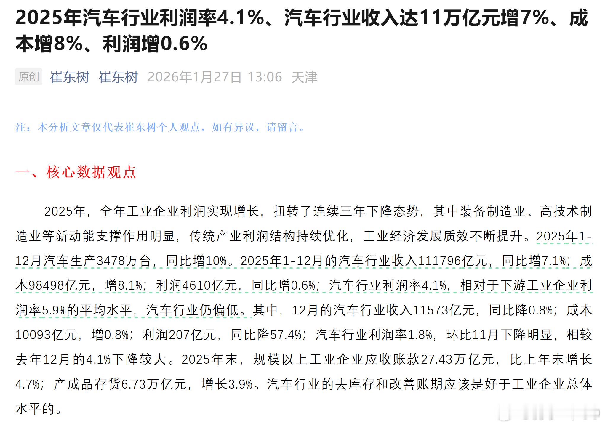 2024年利润率是4.3%,2025年4.1%,其中12月1.8%的利润率更是创下近期低点。2025年汽车行业收入达11万亿元增7%、成本增8%、利润增0.6%。也就能理解后面国家持续重拳反价格内卷