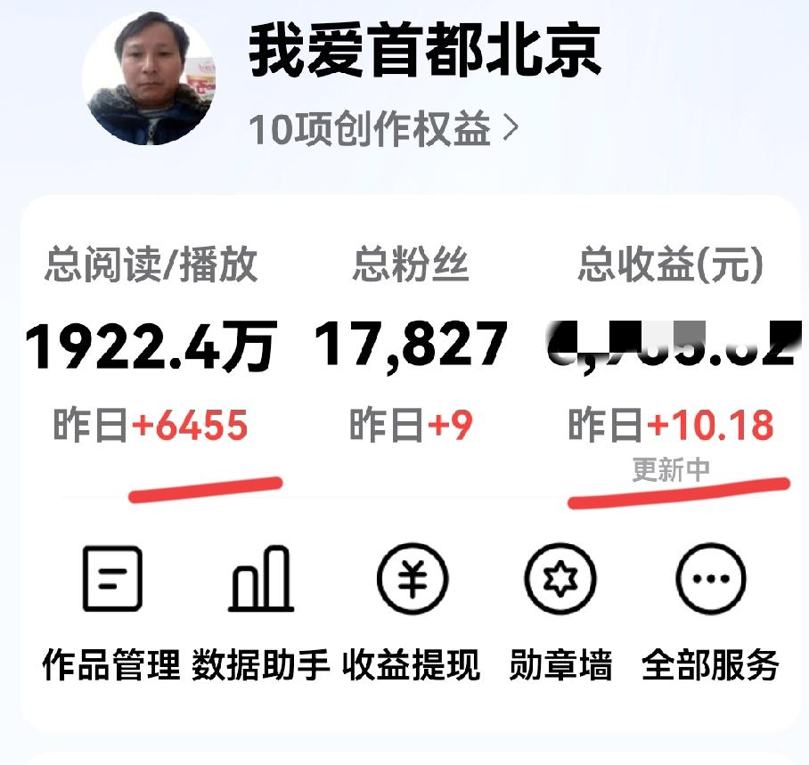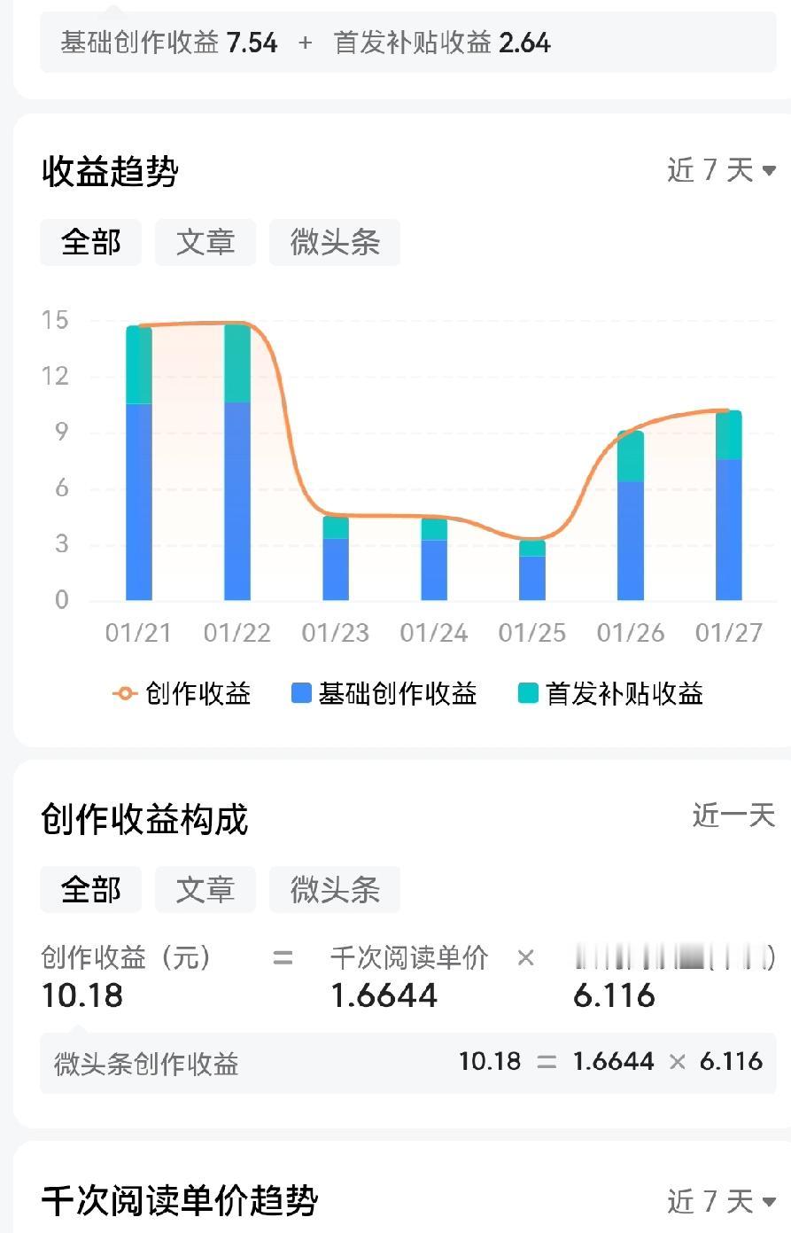 想放弃稍高一点的收益单价,去接受五六毛的收益单价了。 昨天我的阅读量是6455,有效阅读量是6116,头条给的单价是1.6644元,其收益就是10.18元。 为什么突然想要放弃2元左右的单价、去接受五六毛的单价呢?因为我突然觉得分享创作小知识领域太小众化,难以出爆款,一天几千的阅读量实在令人难以忍受! 但国际热点问题领域就不一样,那个领域流量大,运气好的话,一天几篇爆款,其阅读量十万,十大几万是常有的事,虽然单价四五毛,也可能会有几十元的收益。 又想回到以前的那条道了,纠结中!