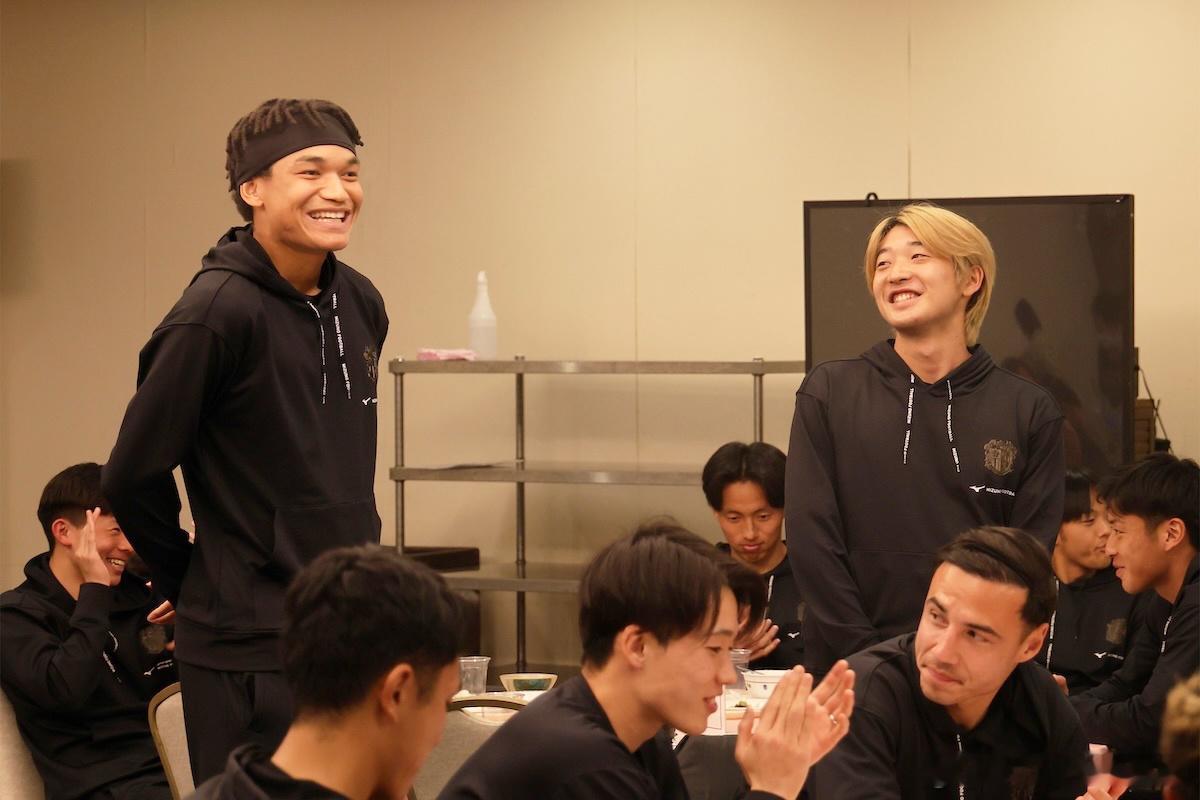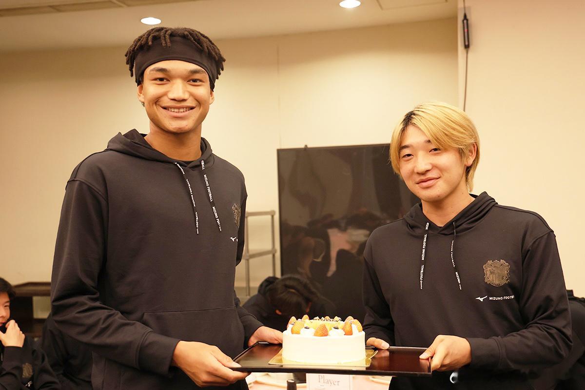 u23日本代表 大阪樱花球员庆祝石渡ネルソン 選手、 横山夢樹選手夺得u23亚洲杯 冠军🏆。久保瑛史選手、イシボウ拳選手送上蛋糕。最后,球队一起合影留念。