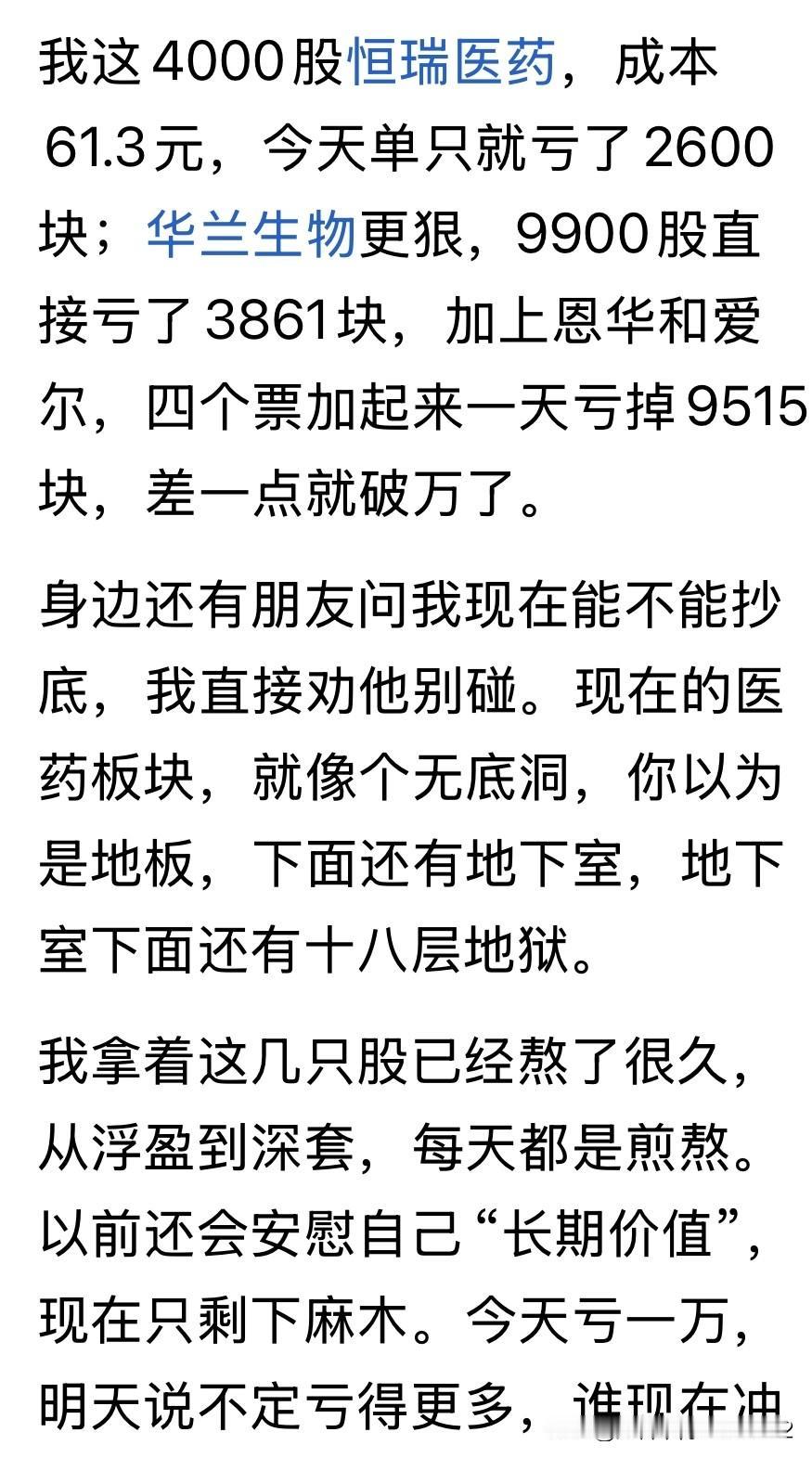 看图说话, 图中描述了一位投资者,讲述自己在这一波行情投资经历的截图。 他本着价值投资的理念和原则,购买了许多以往的医药类的绩优白马股无可厚非,但是在这一波“投资高科技”的行情中,出现了巨额亏损,他伤心透顶了,扪心自问自己的价值投资理念和策略错了吗? 看完这位投资者的投资经历之后,只能说明他没有“顺势而为”,也就是说他在投资股票时没有看清当下这一波行情的“大势”是什么,然后他应该顺着这个趋势去购买股票,这样往往能事半功倍。