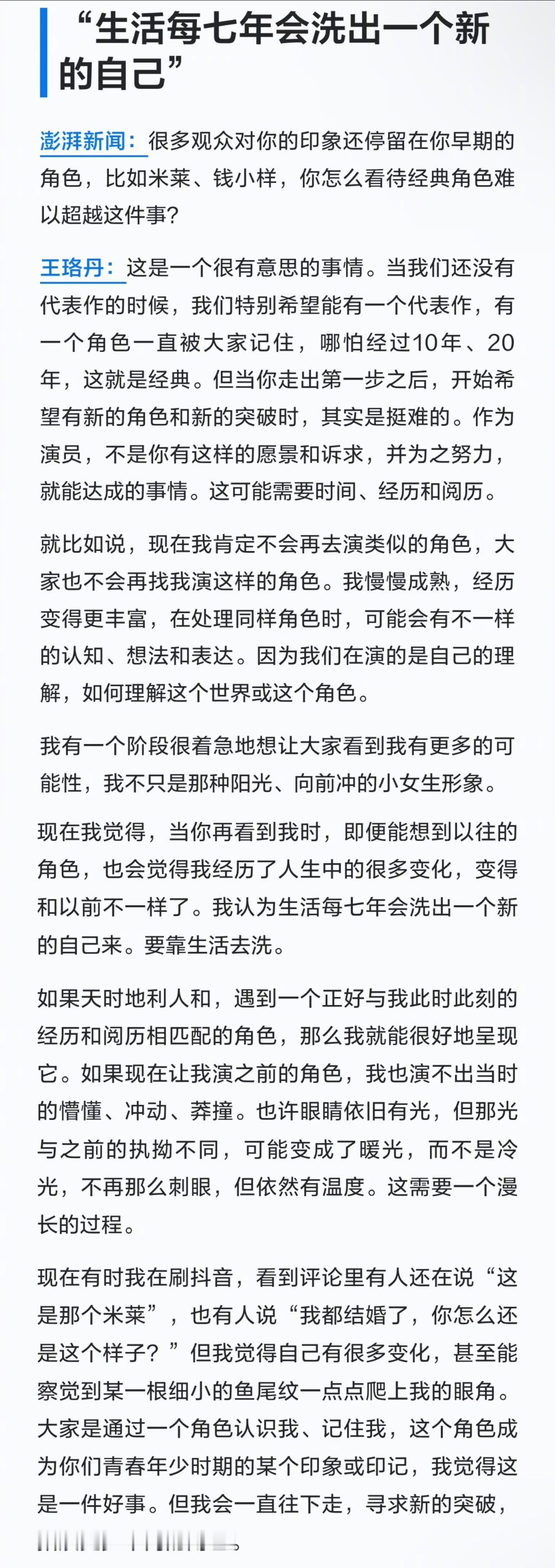 王珞丹的表达欲重新觉醒了 四十岁,表达欲悄然苏醒。不是年少时的喧哗,而是岁月沉淀后的低语,在角色里埋下自己的影子,在台词中听见心跳的回音。王珞丹不再急于证明“我是谁”,而是温柔告诉世界:“我这样走过。”