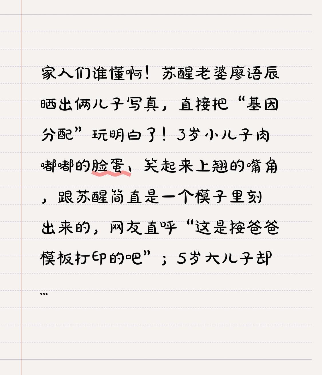 家人们谁懂啊!苏醒老婆廖语辰晒出俩儿子写真,直接把“基因分配”玩明白了!3岁小儿子肉嘟嘟的脸蛋、笑起来上翘的嘴角,跟苏醒简直是一个模子里刻出来的,网友直呼“这是按爸爸模板打印的吧”;5岁大儿子却清秀俊朗,五官神态跟妈妈廖语辰如出一辙,连后脑勺都透着俊俏劲儿!更绝的是,小儿子还自带音乐天赋,3岁就能跟着节拍打节奏、哼旋律不跑调,这遗传也太会挑了! 照片里母子三人穿着黑白牛仔工装,背景就是简单的白墙灰地,没有华丽布景,却满是温馨感。廖语辰一手牵一个娃,动作熟练地帮他们整理衣角,眼神里全是宠溺,配文更是甜到齁:“30岁前喜提俩‘皮夹克’,养育男孩是终极浪漫,我是这个男人帮派里唯一的女主角”。网友纷纷留言:“这家庭氛围也太好磕了,两个儿子一个像爸一个像妈,完美继承优点”“光看照片都能感受到幸福,这才是明星家庭该有的样子”。 但这里藏着关键转折点:比起“基因神复制”的萌娃,苏醒夫妻的相处模式和育儿观更圈粉!谁能想到,这对看起来甜蜜满分的夫妻,当初是不被看好的“姐弟恋”——12岁年龄差、明星与素人的身份鸿沟,一开始就被贴满“必散”标签。可他们用11年的感情长跑打脸质疑:苏醒录节目到凌晨,廖语辰就煲好甜汤送到门口;廖语辰带娃、搞事业两头忙,苏醒再忙也会陪她逛超市十指紧扣,连穿民族风马甲都要选同款,低调撒糖甜度超标。 更让人好感拉满的是苏醒的清醒育儿观!作为明星爸爸,他没有让孩子活在光环里,反而直白告诉儿子:“你现在的一切都是我的,跟你没关系”。当孩子被同学问“你爸是不是明星”时,他没有满足孩子的虚荣心,而是解释“明星就是坚持做喜欢的事的人,你也可以成为这样的人”。带娃时他也从不溺爱,孩子学骑车只在旁边鼓励,不一直搀扶;孩子坚持“1+2=10”,他不直接纠正,而是用实物操作让孩子自己发现答案,这种“祛魅式”养育,让两个孩子活得松弛又独立。 而廖语辰的带娃日常更是接地气到让人共情。她会包下巴士给大儿子办生日宴,用气球鲜花布置得满满仪式感;也会在写真里记录孩子最真实的模样,没有刻意摆拍;带娃拍照片时,她蹲下给孩子擦手、别衣角的动作熟练又自然,完全看不出明星家属的架子。她一边经营自媒体,一边照顾两个孩子,却把日子过得井井有条,让网友忍不住感叹:“这才是平衡家庭与自我的范本,温柔又有力量”。 其实明星家庭的幸福,从来都不在于有多豪华的排场,而在于藏在细节里的爱与陪伴。苏醒夫妻没有靠孩子炒作,没有频繁晒娃博流量,只是偶尔记录家庭日常,却让我们看到了最真实的幸福:夫妻恩爱、亲子和睦,在教育孩子时保持清醒,在经营感情时懂得珍惜。 你觉得俩儿子更像爸爸还是妈妈?被苏醒的育儿观圈粉了吗?评论区聊聊你的看法,也别忘了点赞转发,让更多人看到这份细水长流的幸福!最后祝愿每个家庭都能在平凡日常里,收获属于自己的小美好!