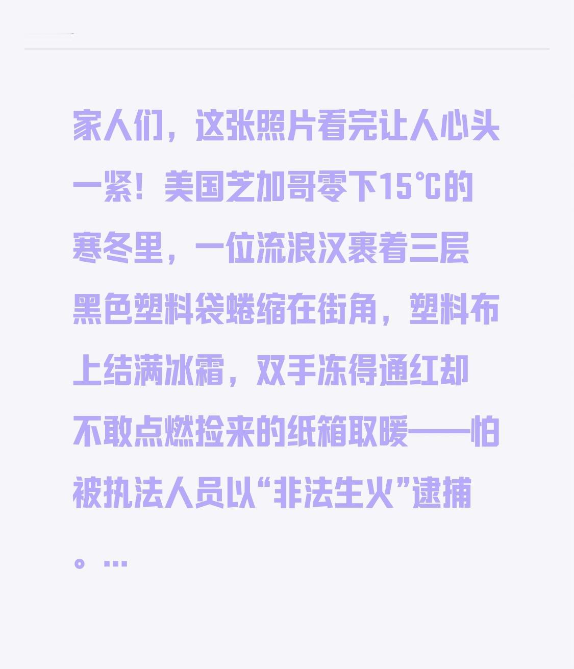 家人们,这张照片看完让人心头一紧!美国芝加哥零下15℃的寒冬里,一位流浪汉裹着三