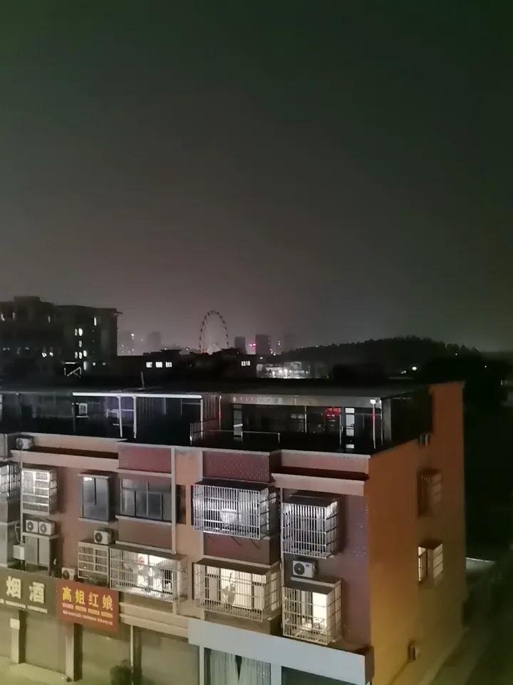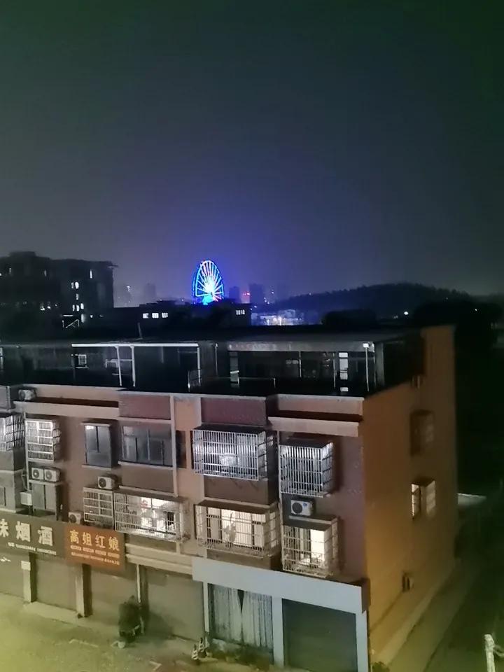 今晚心情特别好,来晒一下夜色美景。瞧,远处那是什么,大圆环还有霓虹灯。那是魔天轮,你坐过吗?晚归灯光