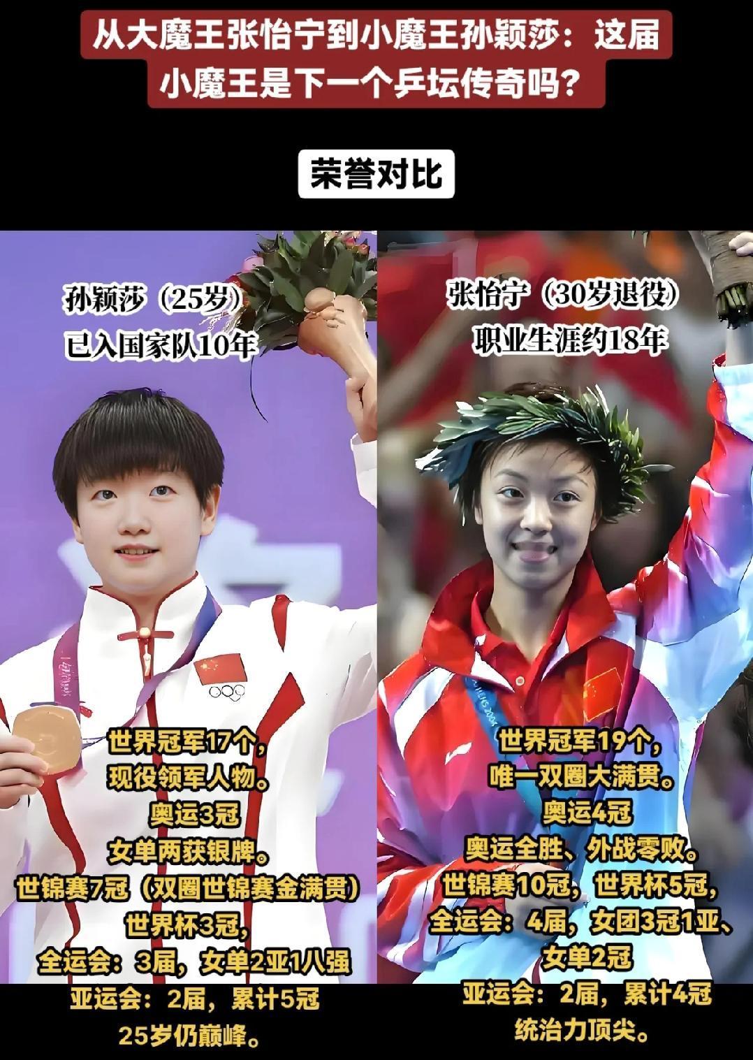 莎莎和偶像张怡宁,俩人都被称为魔王。 看看他们的成就多大。 莎莎是现役领军人物,手握17个世界冠军,入国家队10年。 张怡宁手握19个世界冠军,唯一双圈大满贯。 莎莎从小就是看张怡宁埋下的乒乓球种子,如今不仅在中国在世界都出名。 你们觉得俩人谁厉害?