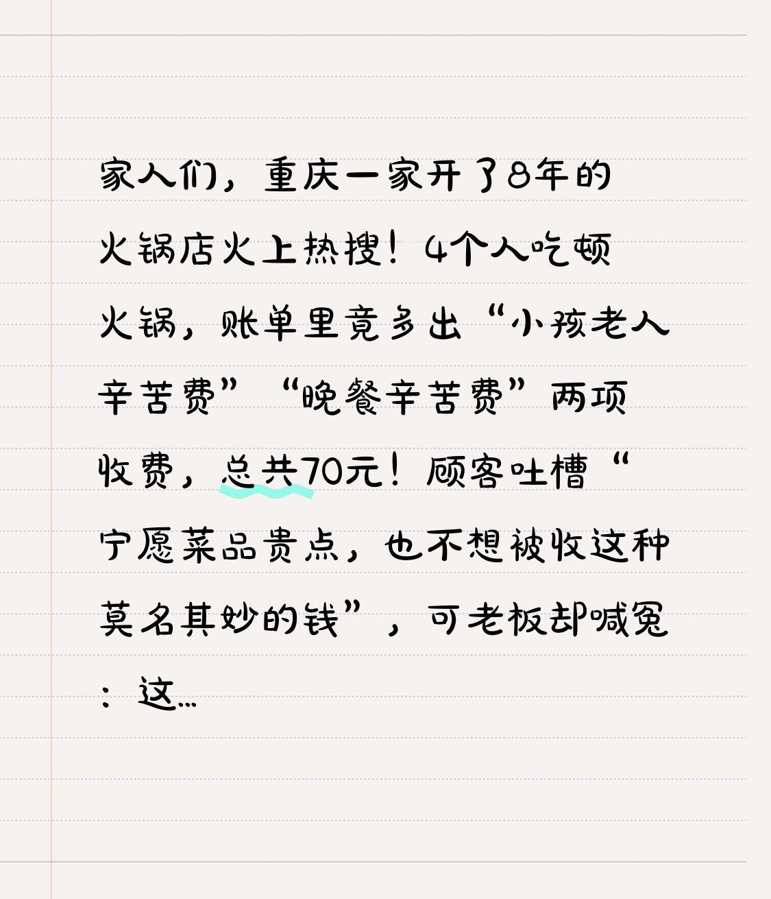 家人们,重庆一家开了8年的火锅店火上热搜!4个人吃顿火锅,账单里竟多出“小孩老人辛苦费”“晚餐辛苦费”两项收费,总共70元!顾客吐槽“宁愿菜品贵点,也不想被收这种莫名其妙的钱”,可老板却喊冤:这是门店唯一的利润来源,所有菜品酒水都按进价卖!到底是商家套路,还是餐饮人的无奈?今天咱们把账算明白! 先看这场争议的来龙去脉:重庆璧山区的正二八百老火锅,最近换了个奇葩经营模式——荤菜最高19元,素菜最低1元,冬瓜、萝卜才1块钱一份,啤酒饮料也全是成本价销售。但对应的,午餐每人收15元“辛苦费”,晚餐每人20元,老人小孩吃一点收10元,这部分钱用来支付房租、员工工资和水电杂费。顾客一行3大1小用餐,被收3份20元晚餐辛苦费和1份10元小孩辛苦费,合计70元,难怪觉得膈应。 但关键转折点来了:老板晒出的菜单和成本单,让不少网友瞬间反转态度!要知道现在餐饮行业有多卷,同地段火锅店的肥牛卷动辄30多一份,而这家店19元就能吃到,素菜普遍3-4元,1元素菜更是比菜市场还便宜。老板钟先生说,开店8年,以前客单价能到八九十元,现在竞争太激烈,只能换模式求生存——砍掉菜品溢价,把利润明明白白放在“辛苦费”里,而且收费标准在门口招牌和菜单上都有标注,店员也会主动告知。 更让人意外的是,这种模式居然有不少顾客买账!有网友算过一笔账:4个人点5荤5素,加上饮料,按传统模式至少要300元,而这家店菜品成本价才180元左右,加上70元辛苦费,总共250元,反而更划算。还有本地食客反馈,“1块钱的冬瓜、4块钱的土豆,比自己在家做还便宜,20元辛苦费买服务和环境,挺值的”。但也有网友坚决反对:“餐饮本就该包含服务,单独收‘辛苦费’名不副实,感觉被变相套路”,就像之前四川乐山那家面馆,标注“免费续面”却临时加价3元,引发全网吐槽,核心就是没做到明码标价、信守承诺。 其实这事儿的核心,早就不是70元的问题,而是收费是否透明、是否等价。根据央视网解读,餐饮行业收取服务费并非不行,但必须满足两个条件:一是提前明确告知消费者,保障知情权;二是服务与费用匹配,不能强制收取。这家火锅店的优势在于明码标价,没有事后加价,但“辛苦费”的叫法容易让人误解,如果换成“服务费”或“座位费”,接受度可能会高很多。 而背后更值得深思的,是餐饮人的生存困境。现在房租、人工成本年年涨,食材价格波动大,很多中小餐饮老板都在亏本边缘挣扎。要么靠菜品溢价赚钱,被骂“太贵”;要么像这家火锅店一样,把成本拆分,又引发争议。就像老板说的:“做餐饮就是挣点辛苦钱,与其在菜品里藏猫腻,不如把账算在明处”。比起那些悄悄涨价、缺斤短两的商家,这种透明化经营,反而多了一份真诚。 不过也有网友提出疑问:如果顾客食量特别大,会不会让商家亏本?老板回应,开业一个多月,顾客接受度还可以,遇到大胃王确实会少赚点,但大多数人都能理解。毕竟餐饮行业讲究双赢,商家不玩套路,消费者得到实惠,才能长久走下去。 其实这场争议,本质上是消费者对“隐形消费”的警惕,和商家对“透明经营”的尝试。在这个餐饮内卷的时代,你更愿意接受传统的菜品定价模式,还是这种“成本价菜品+明码服务费”的新模式? 你觉得这家火锅店的“辛苦费”合理吗?如果遇到这种收费方式,你会买单吗?评论区聊聊你的看法,也别忘了点赞转发,让更多人参与讨论!最后希望餐饮老板们都能诚信经营,消费者也能多一份理解,毕竟好的消费环境需要双方共同维护!