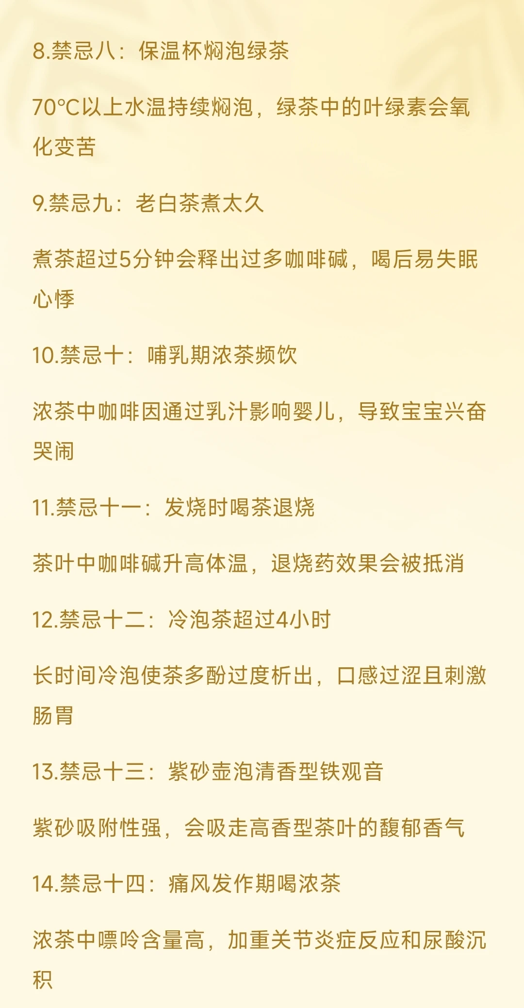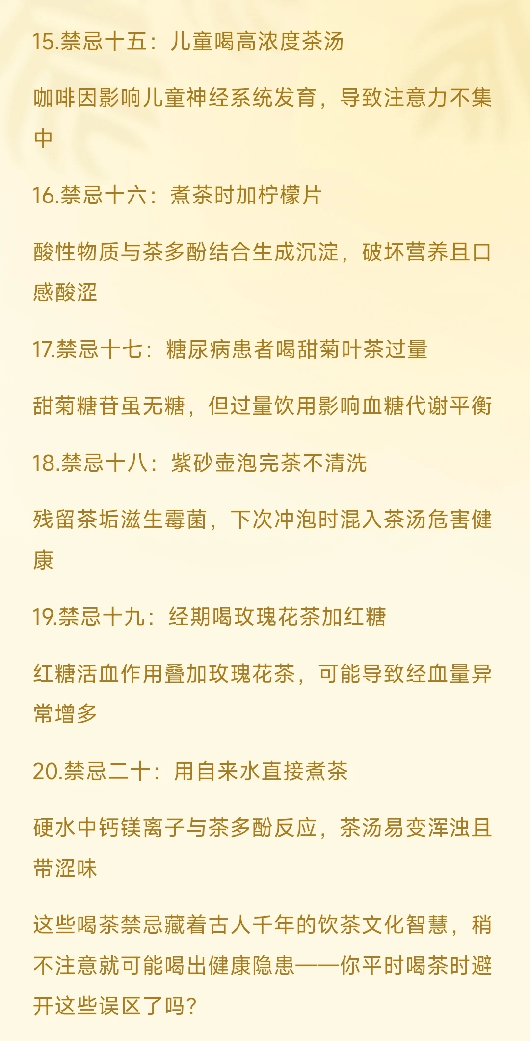 1.禁忌一:绿茶不碰紫砂壶 紫砂壶保温性强,会闷熟绿茶的鲜嫩芽叶,破坏清香口感 ​​2.禁忌二:红茶别加冰 全发酵茶性温,加冰饮用易导致脾胃虚寒,引发腹痛 ​​3.禁忌三:普洱生茶空腹喝 未经渥堆的生茶茶多酚含量高,空腹刺激胃黏膜 ​​4.禁忌四:菊花茶久泡 菊花泡超过15分钟会释出花青素,口感变酸涩且寒性加重 ​​5.禁忌五:隔夜茶留着喝 放置超8小时的茶汤滋生细菌,亚硝酸盐含量升高 ​​6.禁忌六:服药时用茶送 茶多酚与药物成分结合,降低药效还可能引发不良反应 ​​7.禁忌七:酒后立即喝茶 茶碱加速肾脏代谢酒精,易导致膀胱刺激和心律不齐 ​​8.禁忌八:保温杯焖泡绿茶 70℃以上水温持续焖泡,绿茶中的叶绿素会氧化变苦 ​​9.禁忌九:老白茶煮太久 煮茶超过5分钟会释出过多咖啡碱,喝后易失眠心悸 ​​10.禁忌十:哺乳期浓茶频饮 浓茶中咖啡因通过乳汁影响婴儿,导致宝宝兴奋哭闹 ​​11.禁忌十一:发烧时喝茶退烧 茶叶中咖啡碱升高体温,退烧药效果会被抵消 ​​12.禁忌十二:冷泡茶超过4小时 长时间冷泡使茶多酚过度析出,口感过涩且刺激肠胃 ​​13.禁忌十三:紫砂壶泡清香型铁观音 紫砂吸附性强,会吸走高香型茶叶的馥郁香气 ​​14.禁忌十四:痛风发作期喝浓茶 浓茶中嘌呤含量高,加重关节炎症反应和尿酸沉积 ​​15.禁忌十五:儿童喝高浓度茶汤 咖啡因影响儿童神经系统发育,导致注意力不集中 ​​16.禁忌十六:煮茶时加柠檬片 酸性物质与茶多酚结合生成沉淀,破坏营养且口感酸涩 ​​17.禁忌十七:糖尿病患者喝甜菊叶茶过量 甜菊糖苷虽无糖,但过量饮用影响血糖代谢平衡 ​​18.禁忌十八:紫砂壶泡完茶不清洗 残留茶垢滋生霉菌,下次冲泡时混入茶汤危害健康 ​​19.禁忌十九:经期喝玫瑰花茶加红糖 红糖活血作用叠加玫瑰花茶,可能导致经血量异常增多 ​​20.禁忌二十:用自来水直接煮茶 硬水中钙镁离子与茶多酚反应,茶汤易变浑浊且带涩味 ​​这些喝茶禁忌藏着古人千年的饮茶文化智慧,稍不注意就可能喝出健康隐患——你平时喝茶时避开这些误区了吗?
