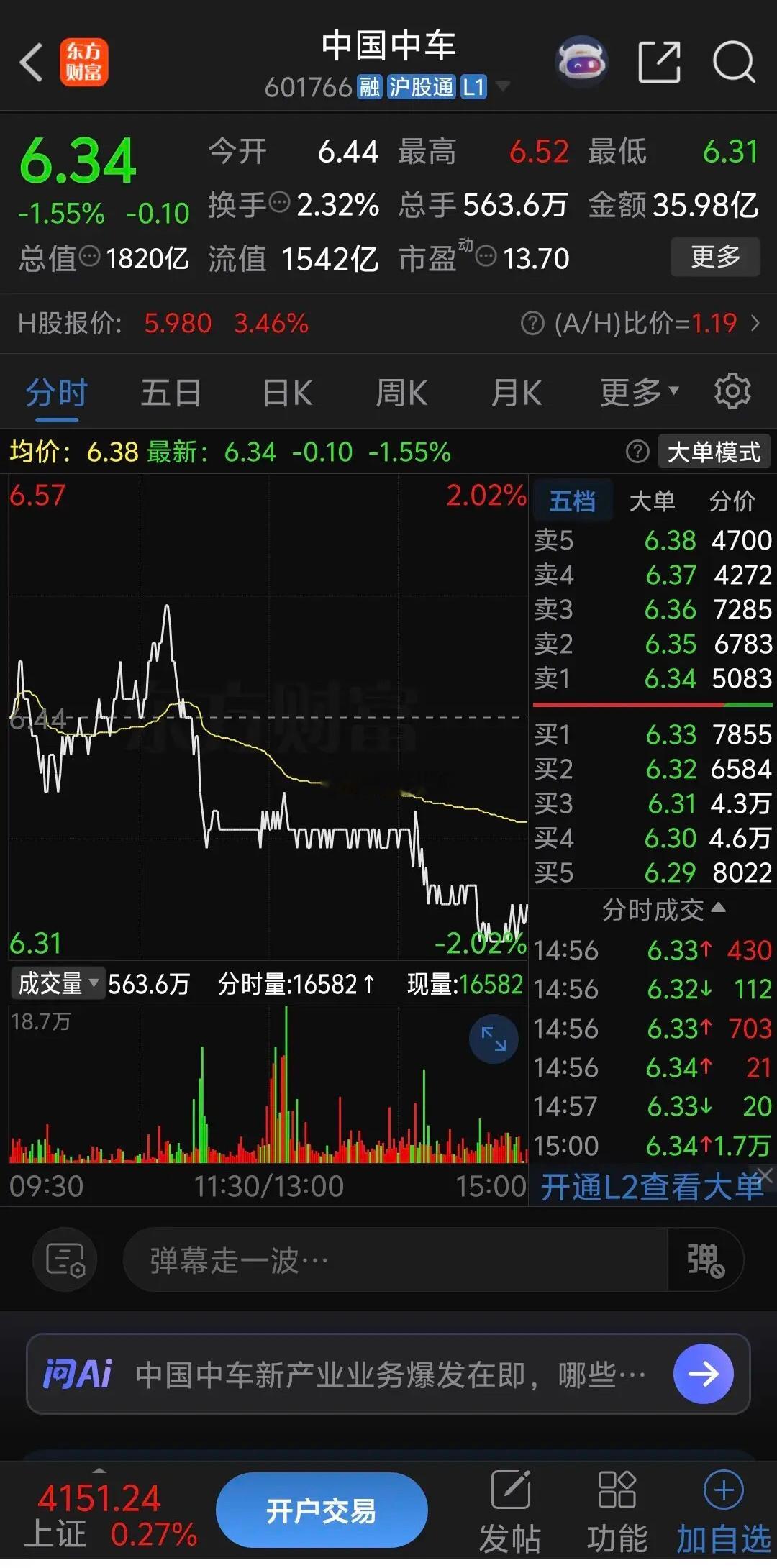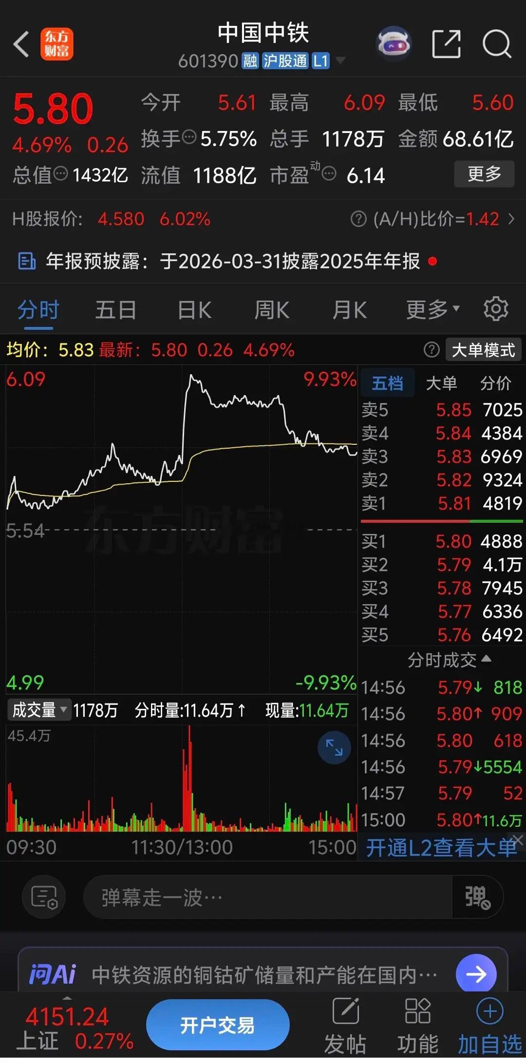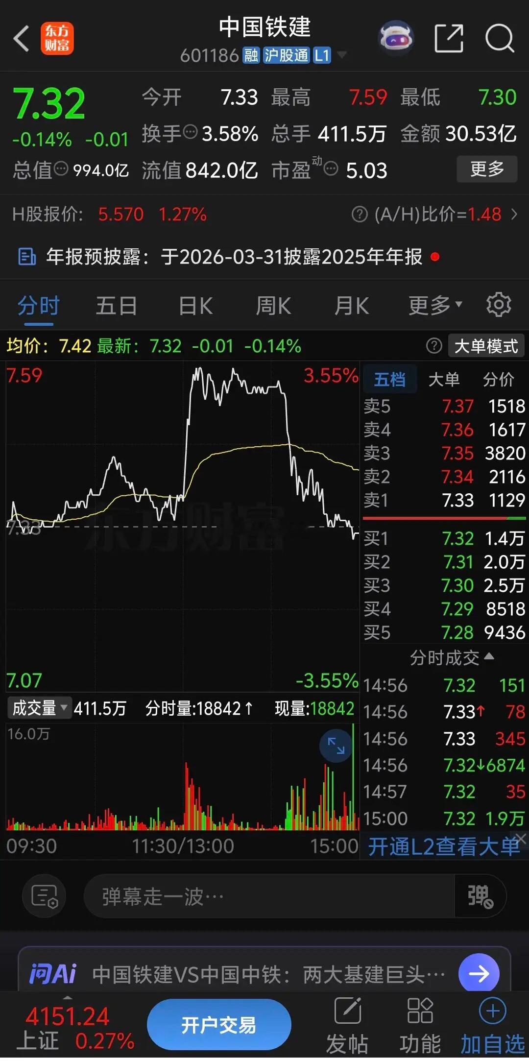 中国建筑跌的太惨了居然跌破5元关口,早盘高开回落受5.00关口支撑维持震荡,之后反弹上涨,下午2点9分突然遭到不明资金大单持续砸盘打压,股价快速跳水,细心的股民观察到只要打压一停止马上就企稳,令股民遗憾的是下午持续打压了4波,股价惨烈跌破5元关口,每股净资产高达11.67股价仅仅只有4.96创新低。中国中车也被打压连续下跌6天创新低,不过中国中铁值得股民注意,今天盘中再次冲击涨停板,成交额高达68亿,这波操作的确很难看懂,长期价值投资者千万不要割肉了。