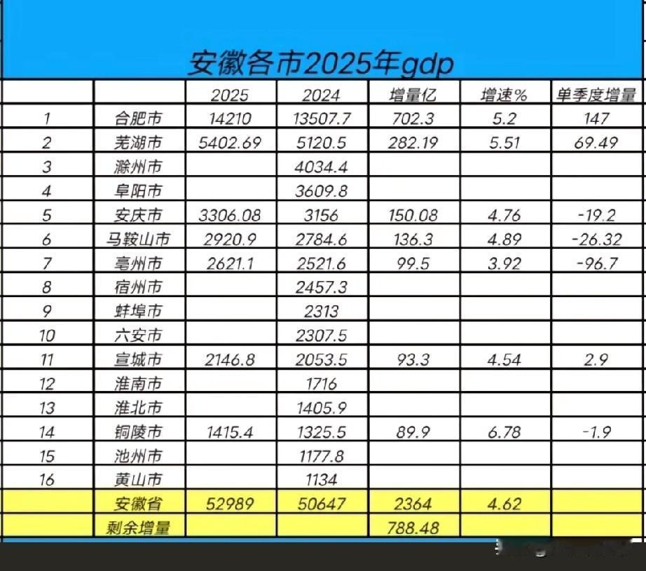 合肥和芜湖占比安徽经济比重上升到37%,人口比重22% 安徽有16个地级市,明确主副中心城市是合肥和芜湖,合芜两市也是安徽经济扛大梁城市,对于全省发展起到重要的支撑作用。 2025年合肥和芜湖的经济总量合计19610.69亿元,占比安徽省比重高达37%, 合肥和芜湖的人口总量为1380万人,占比安徽省比重22%。 汽车产业是安徽省首位产业,合肥和芜湖的汽车制造、高端装备制造、新材料、智能家电、新能源和节能环保等战略性新兴产业产值占比超全省40%以上。 两市龙头产业的发展,拉动了全省工业发展水平。安徽经济排名 合肥城市竞争力 安徽经济实力 合肥GDP增速 合肥经济增长