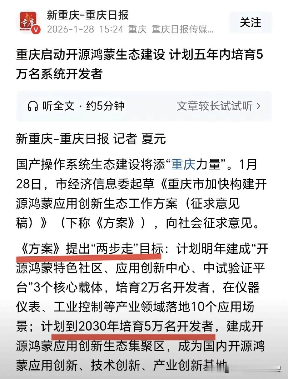 1月28日,重庆发布鸿蒙生态建设方案,计划五年内培养5万名鸿蒙系统开发者,推动老工业基地转型,建设数字经济“高地”。 重庆采用“平台+技术+场景+人才”的模式,解决城市发展中“缺载体、缺场景、缺人才”的问题。 目前已建成以鸿蒙为核心的社区和创新中心,涉及医疗、工业、交通等多个场景。鸿蒙系统已通过国家安全检测,获得最高安全认证,未来十年将有更多机会。