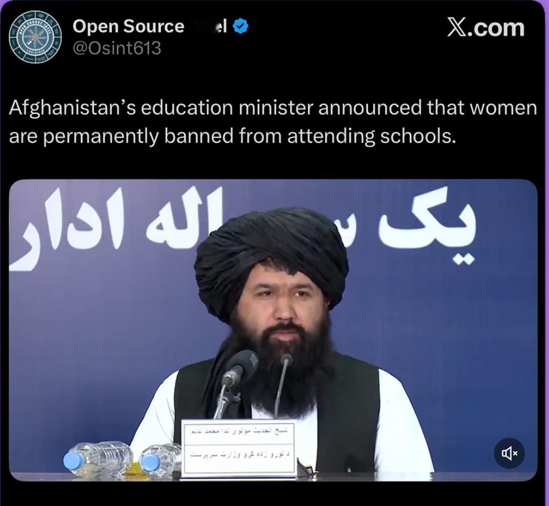 【琅河财经】阿富汗教育部长宣布永久禁止阿富汗女性上学 截至 2026 年 1 月,阿富汗 12 岁以上女童已被剥夺中学受教育权超过 1,500 天,女性被剥夺大学受教育权超过 1,100 天。 2024 年底至 2025 年间,塔利班还发布了针对女性参加医疗培训(护理和助产)的限制,进一步压缩了女性残存的受教育空间。