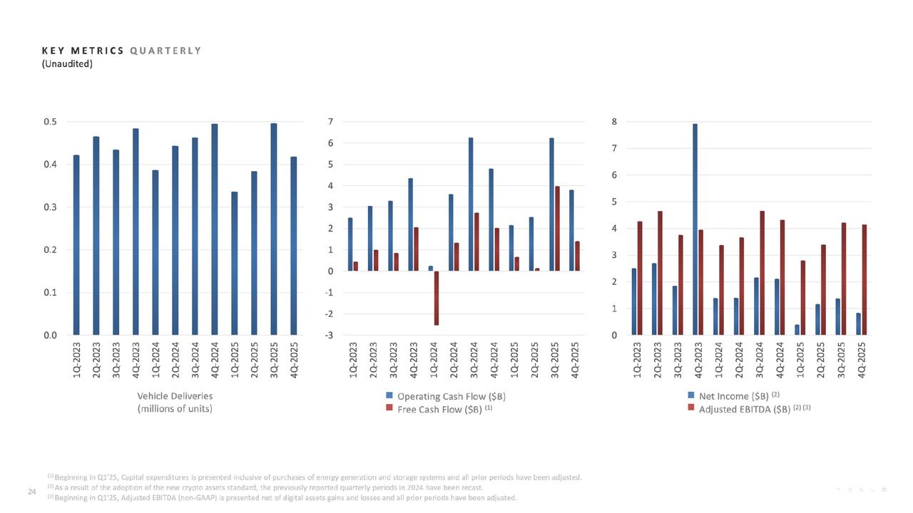 特斯拉2025年第四季度财报+全年财报。 主要看一下盈利情况: -2025年GAAP营业利润为44亿美元,净利润38亿美元,非GAAP净利润59亿。 -2025年GAAP第四季度营业利润14亿美元,净利润8亿美元,非GAAP净利润18亿美元。 Tips: 让豆包总结了一下GAAP。 GAAP盈利:法定披露口径,必须严格按「美国通用会计准则」编制,包含所有符合准则的收支,结果具可比性与审计要求。 相对大笔开支的「股票激励」也算在GAAP盈利中。 非GAAP盈利:公司补充口径,剔除与核心经营无关的项目,用于向投资者展示 主营业务真实盈利能力, 不具法定强制力。【来自懂车帝车友圈】