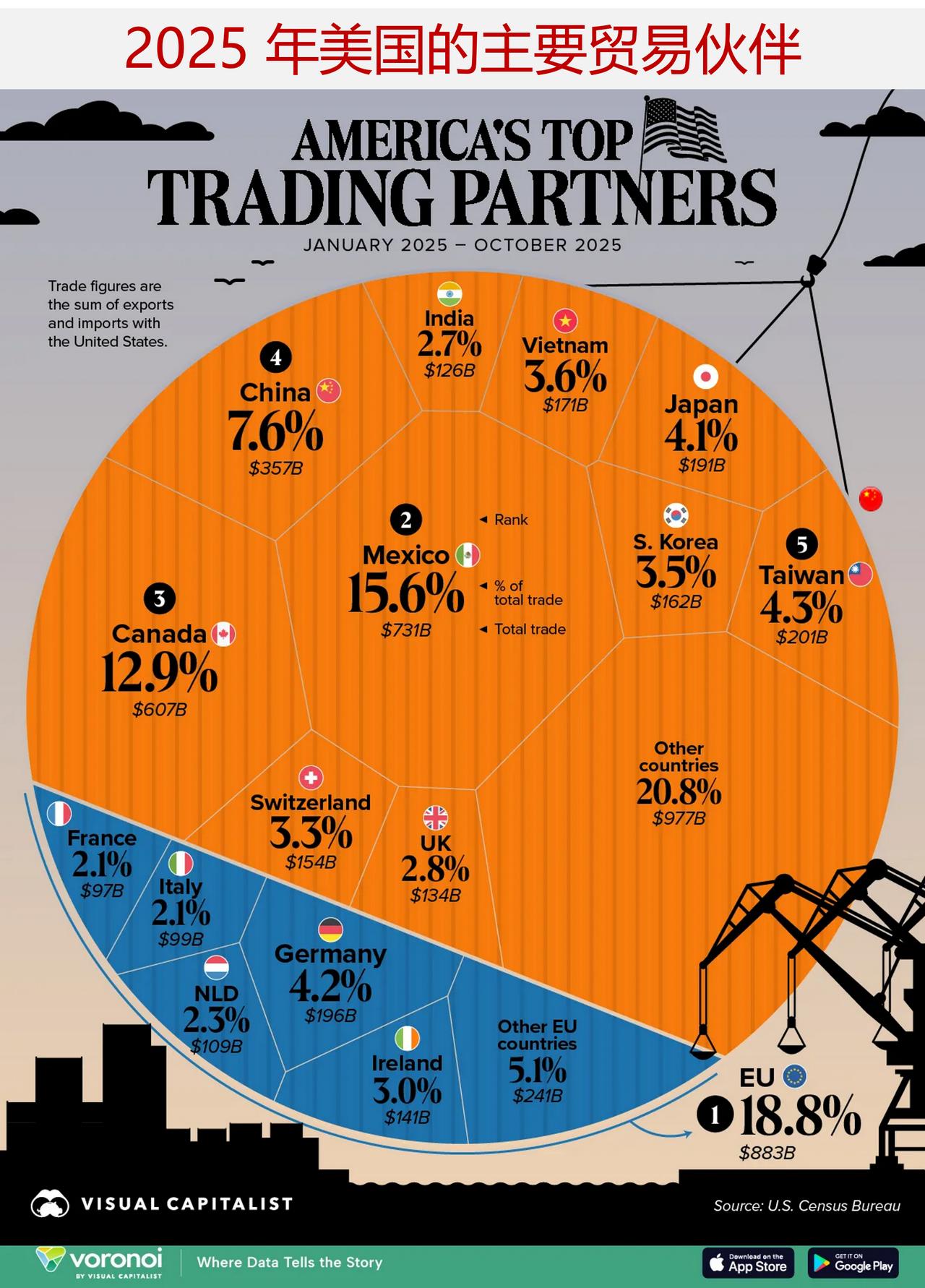 2025 年美国的主要贸易伙伴是哪些,中国与美国贸易有何变化? 在 2025 年 1 月至 10 月期间,美国的双边贸易额达到了 4.7 万亿美元,而这一年对于贸易政策而言是充满变数的一年。 作为美国最大的贸易伙伴,欧盟在贸易流中起着至关重要的作用。虽然与格陵兰相关的关税曾短暂威胁要对八个欧盟国家征收,但这些关税后来被取消了。然而,欧盟内部的贸易动态各不相同。美国与荷兰和比利时等国存在贸易顺差,而与爱尔兰和德国则存在贸易逆差。 下面这张图表展示了截至 2025 年 10 月美国最大的贸易伙伴情况,数据来源于美国人口普查局。 与欧盟的贸易额达到了 8833 亿美元,其中德国(1964 亿美元)、爱尔兰(1408 亿美元)和荷兰(1087 亿美元)的贸易额占据了总体贸易活动的大部分份额。 2025 年 8 月,美国和欧盟达成一项协议,规定对大多数商品设定 15%的关税上限,而美国对钢铁和铝产品现行的 50%关税则对所有全球贸易伙伴保持不变。 墨西哥紧随其后,2025 年其跨境贸易额将达到 7312 亿美元。在 2025 年 2 月美国对墨西哥进口商品宣布征收关税后,后续的谈判导致了延期以及部分豁免的情况出现。 排名第三的是加拿大,其贸易额达 6067 亿美元。 与此同时,美中贸易总额达 3572 亿美元,截至 10 月底,美国对华贸易逆差为 1754 亿美元。在此期间,美国从中国的进口额下降了 26.7%,这一降幅在美所有贸易伙伴中是最大的。 相比之下,在贸易格局变化的背景下,美国从越南的进口量激增了 40.4%,从泰国的进口量增长了 37.4%。至于印度,作为美国的第 11 大贸易伙伴,其贸易额较之前同期小幅增长至 1264 亿美元。中美贸易关系