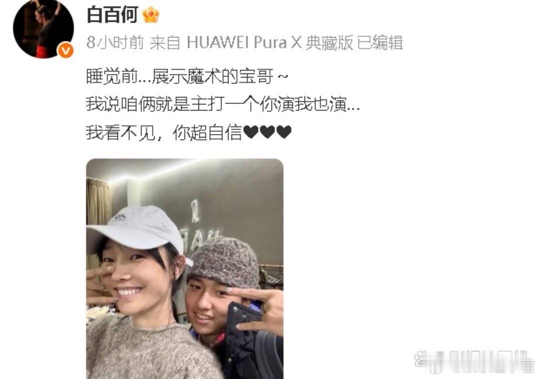 白百何晒与18岁元宝合照白百何晒与18岁儿子元宝合照,母子俩同款美甲比出相同手势,“我说咱俩就是主打一个你演我也演…”很好的母子关系!