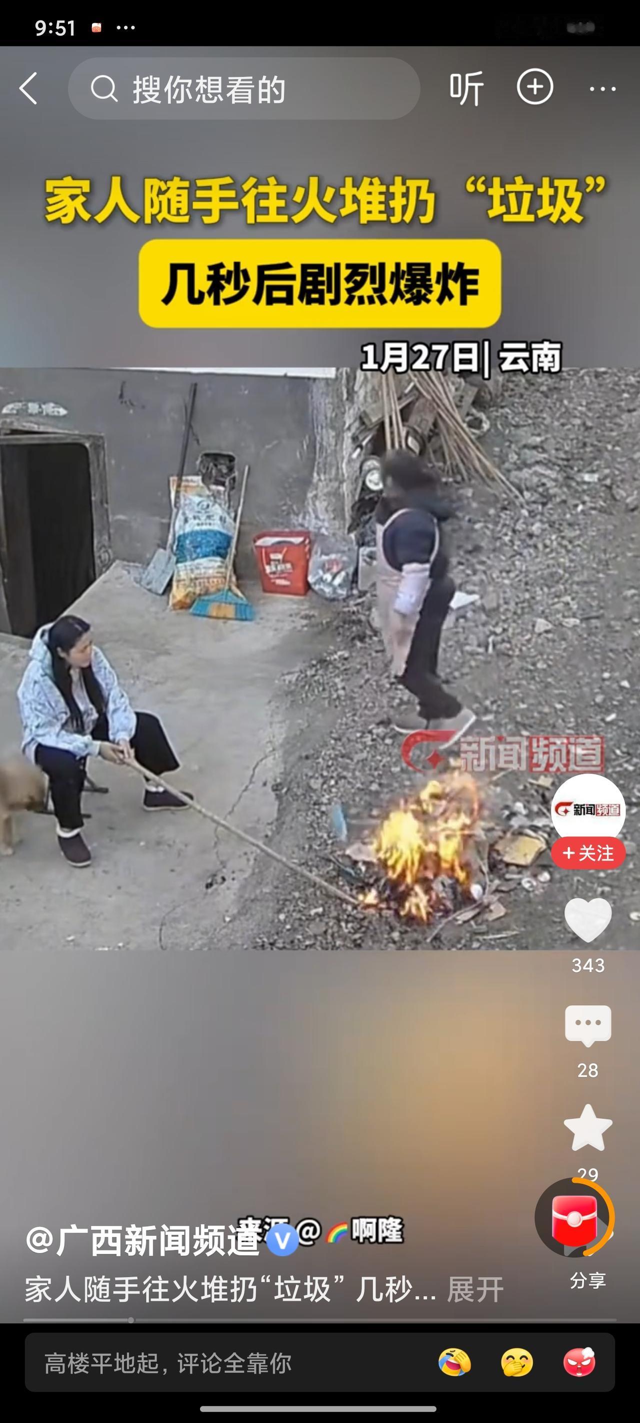 云南烧垃圾突发爆炸 女子面部被烧伤太揪心 1月27日云南,女子正烧垃圾,家人随手扔了件不明物品进火堆,几秒后就轰然爆炸,女子当场面部被烧伤! 网友直呼后怕: “随手一扔的代价太惨痛了,这意外完全能避免” “烧垃圾前一定要仔细检查,太吓人了” 真的感慨,居家安全从无小事,别让一时疏忽酿大祸!