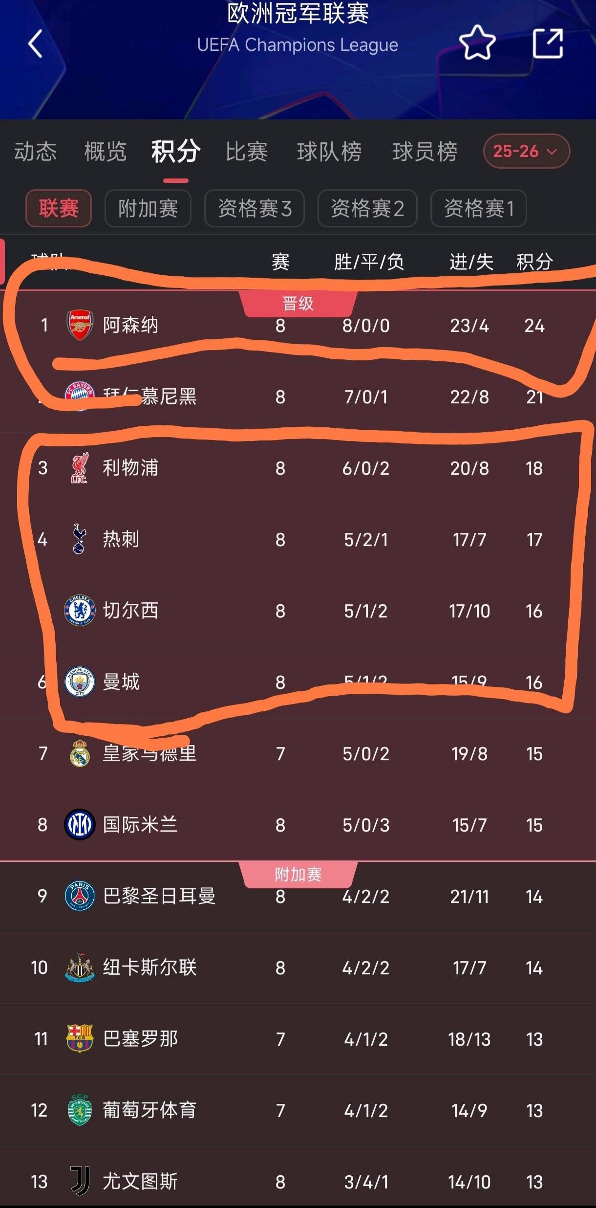 今年欧冠积分榜,好像英超积分榜呀。 1阿森纳,无敌之师,八连胜小组无敌。 3利物浦,英超都没踢好要换帅球队。 4热刺,英超保级队。 5切尔西,刚换教练的球队。 6曼城,最近成绩不好。 前六名把拜仁去掉,就是另一个英超积分榜。 看得曼联心痒痒,要是红魔来参加,估计也能前八名!! 另外纽卡斯尔第12也不丢脸。[耶]