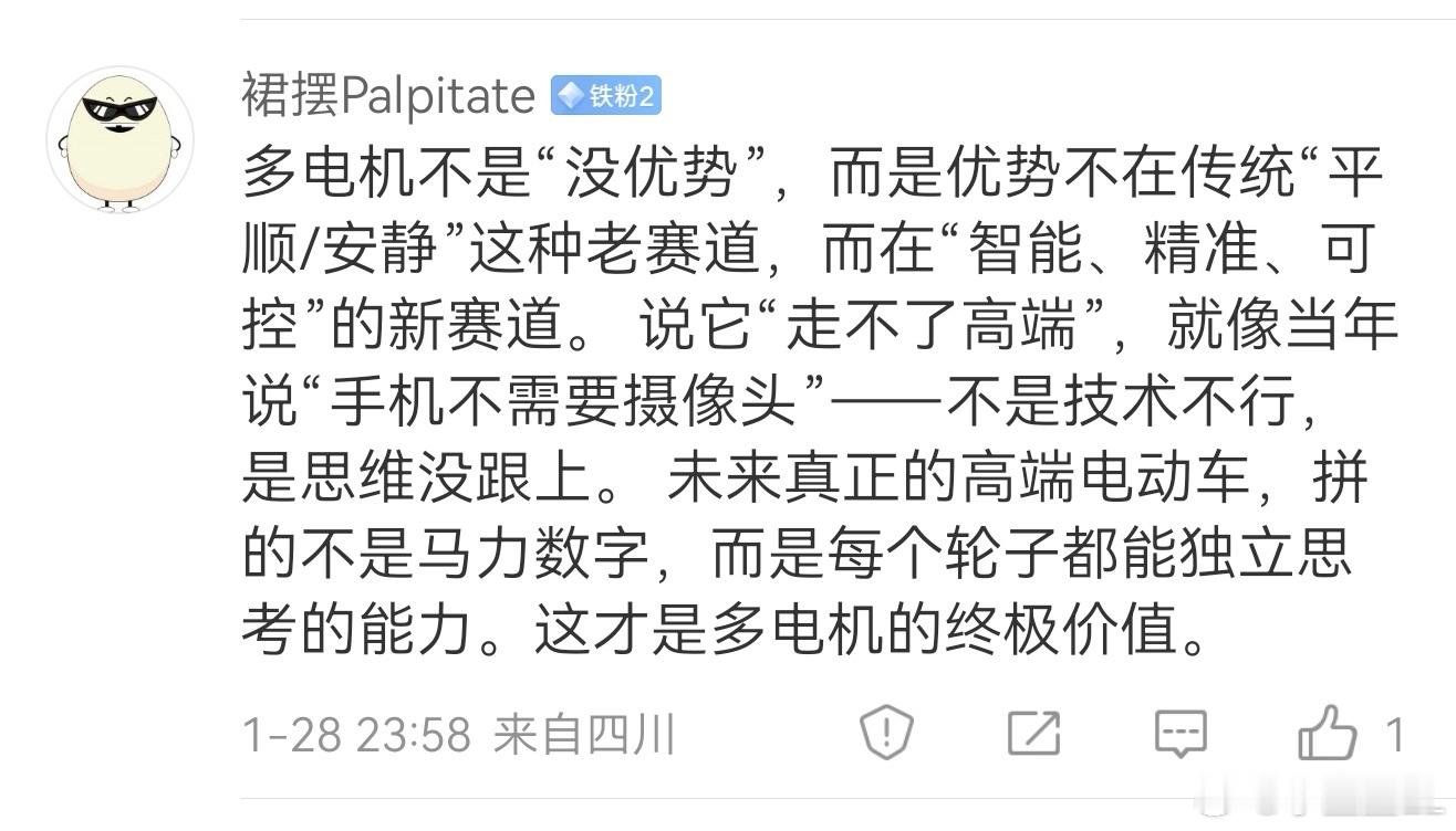 说了半天不还是证明了多电机这条路没优势,也走不通?什么叫智能、精准、可控?你每天就开着车从家里到公司去上班,你能感受到什么智能、精准、可控?这些名词都体现在什么地方?具体应用场景又是哪些?什么叫让每个轮子都有思考能力?轮子只负责转就完了,要它思考什么?轮子有没有思考能力我不知道,我只知道人都快没思考能力了。多电机技术路线,你唯一能感受到的是不是只有高电耗、短续航?