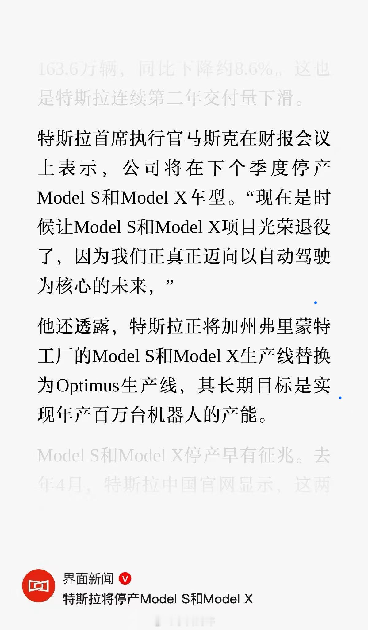 ModelS和ModelX项目将终止特斯拉官方宣布将停产Model S和Model X,马斯克:“是时候让Model S和Model X项目光荣退役了”。至于原先生产线将替换为Optimus 特斯拉将停产ModelS和ModelX