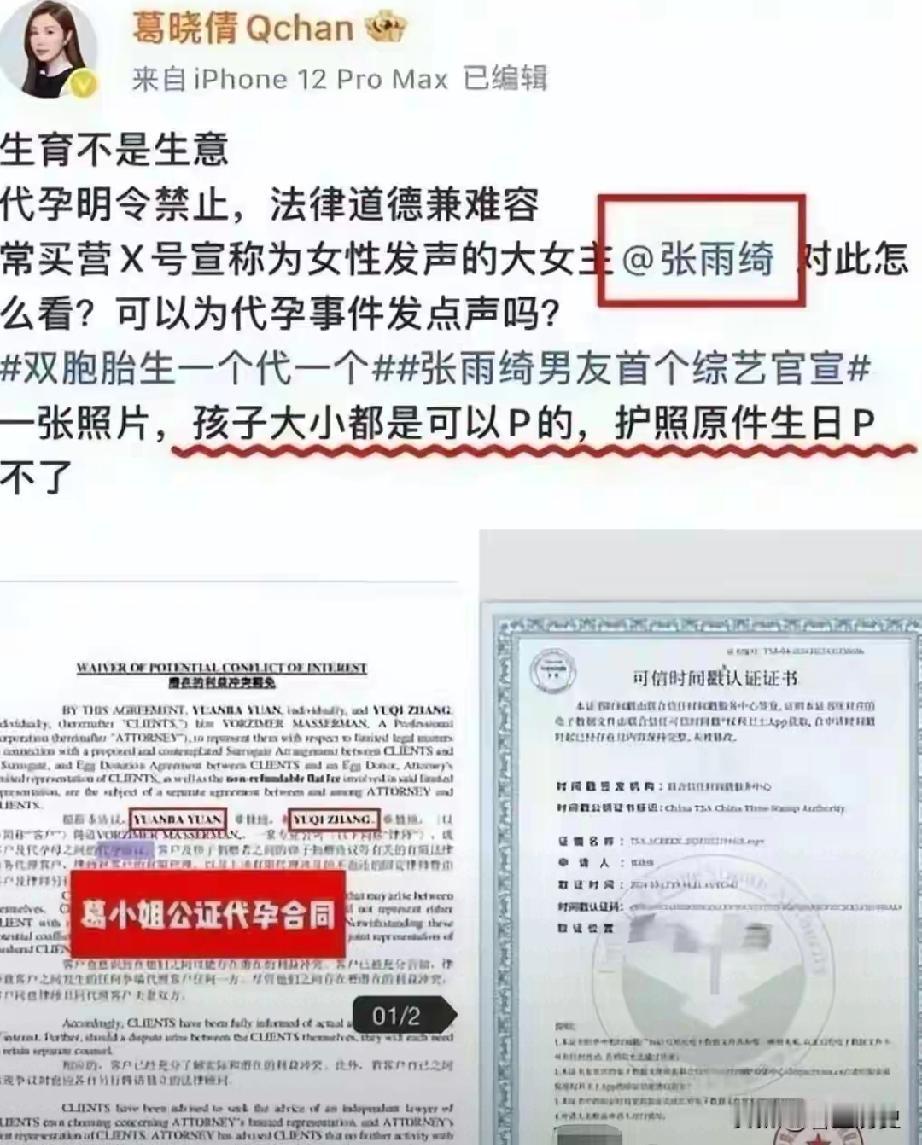 张雨绮这次真要凉凉了?前夫前妻葛晓倩重锤出击,代孕风波越闹越大!公证护照显示双胞胎出生日期差仨月,这哪是双胞胎啊? 工作室晒孕照却避谈日期矛盾,这不是此地无银三百两嘛!代孕违法,郑某就是前车之鉴。 更劲爆的是,她还被曝插足婚姻、威胁爆料人。如今辽宁春晚除名、品牌纷纷解约,影视综艺也受牵连。 情感问题能公关,违法红线可碰不得!张雨绮再沉默下去,怕是要彻底退出娱乐圈了! 免责声明:文章描述过程、图片都来源于网络,此文章旨在倡导社会正能量,无低俗等不良引导。如涉及版权或者人物侵权问题,请及时联系我们,我们将第一时间删除内容!如有事件存疑部分,联系后即刻删除或作出更改。 张雨绮 张雨绮红毯造型