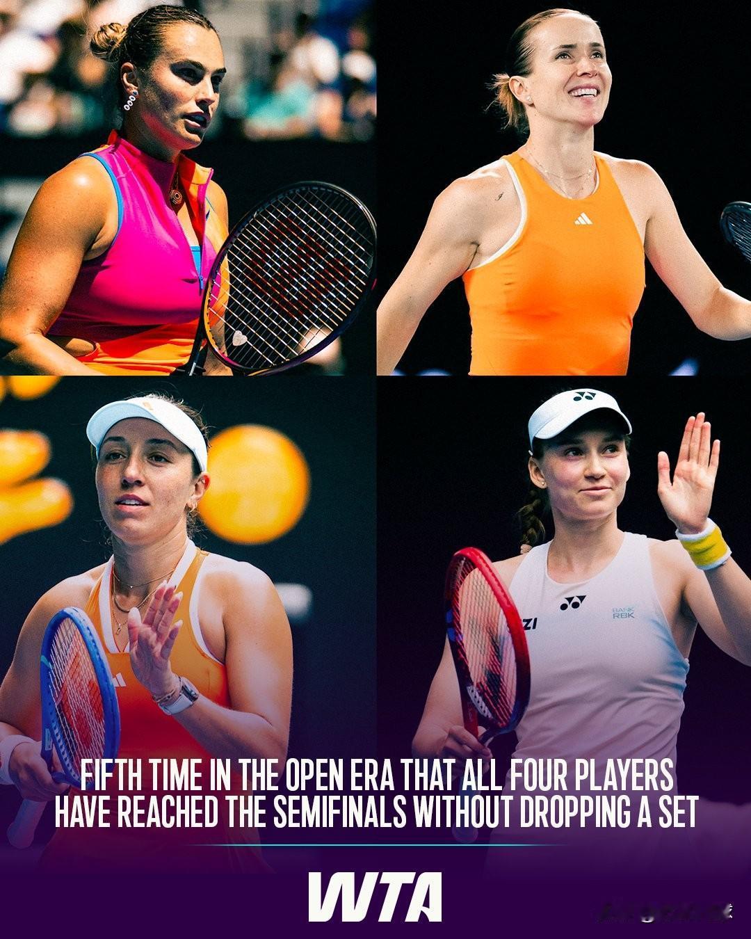 历史写下新篇章! 公开赛年代以来第5次, 打进大满贯半决赛的四位选手在晋级之路上均不失一盘。 澳网1970 美网1976 美网1980 法网1995 澳网2026 网坛风云