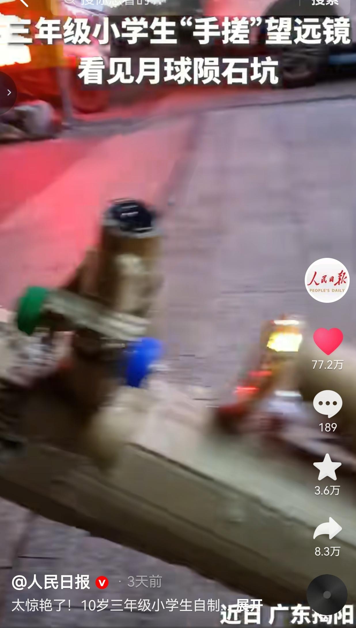 火上人民日报了!近日,广东揭阳一个10岁的三年级小男孩,用自家不花钱的纸板、木棍、PVC水管等材料,以及在网上买了主镜、副镜、目镜,总共只花了28块钱,断断续续捣鼓了好几天,居然造出了一台能清晰看到月球陨石坑的天文望远镜。 镜头里,他举着自己做的“宝贝”,眼睛亮得像星星。 透过镜片,月球表面的环形山清清楚楚,坑坑洼洼的细节都能看见。 网友看到后评论说:“这才是真正的科创!我给儿子买了几千块的天文望远镜,他拆都没拆,还不如人家28块的纸板管用!” 还有的网友说:“虽然孩子制作的望远镜歪歪扭扭的,可是,这比我买的任何模型都有意义。既锻炼了孩子的动手能力,也培养了孩子热爱科学的精神。” 身为家长,我们有一个误区,我们总以为,要给孩子最好的,就得是最贵的。买进口的玩具,报最贵的兴趣班,带他去最火的科技馆,好像把钱花出去,孩子就能赢在起跑线上。 可这个10岁的小男孩告诉我们:真正的好奇心和创造力,从来不需要靠钱堆砌的。 他没有专业的工具,没有昂贵的零件,甚至可能连一本正经的天文课都没上过。他有的只是对“月亮上到底有什么”的执念,和一双愿意动手的手。 他制作的望远镜看起来没有那么美观,歪歪扭扭的,镜片也不是专业级别的。但当他第一次透过镜片看到月球陨石坑的那一刻,眼里的光,比任何昂贵的玩具都珍贵。 这个小男孩的故事,让我想起了一句话:“最好的教育,是让孩子成为他自己。” 他不需要成为别人眼中的“神童”,也不需要用奖杯和奖状来证明自己。 他只需要在一次次动手尝试中,明白原来我也可以,在一次次失败重来后,懂得坚持真的有用。 大家觉得呢?欢迎大家评论区讨论留言。