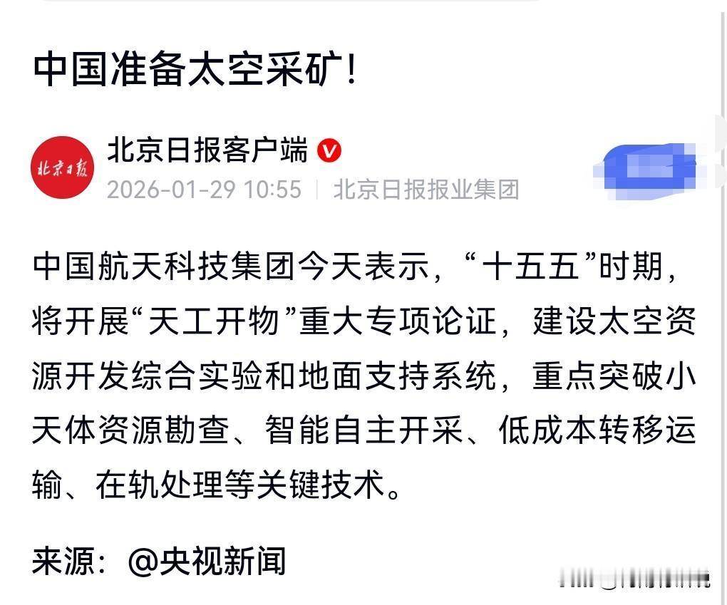 好消息,好消息,真是听得让人相当的热血沸腾啊。 作为一个中国人,真的是越来越有自豪感了。 1月29日热搜,中国准备太空采矿。 虽然我不明白具体是怎么一回事,但听着就很厉害的样子,有没有。 地球上的资源确实不太够了,我们不得不放眼未来,去到太空采矿。 这种前瞻性实在是太伟大了。 以前是放眼世界,如今我们要做到放眼宇宙。
