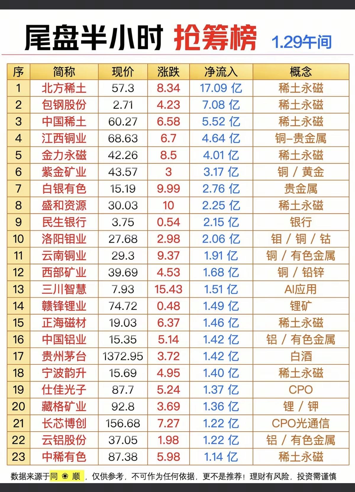 1.29周四 尾盘半小时 主力抢筹个股榜? 稀土永磁,铜金属,银行,有色金属等