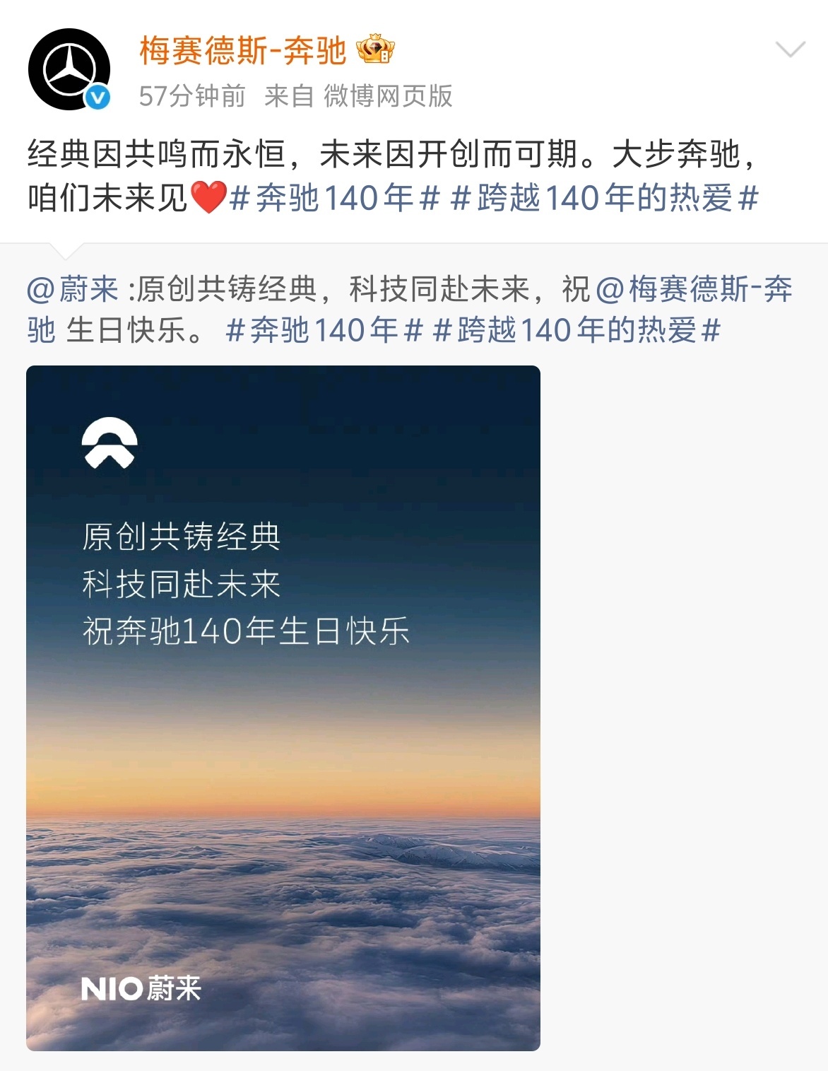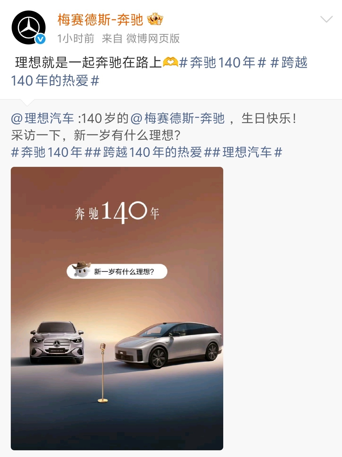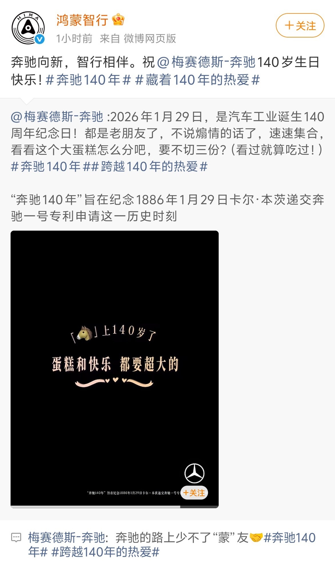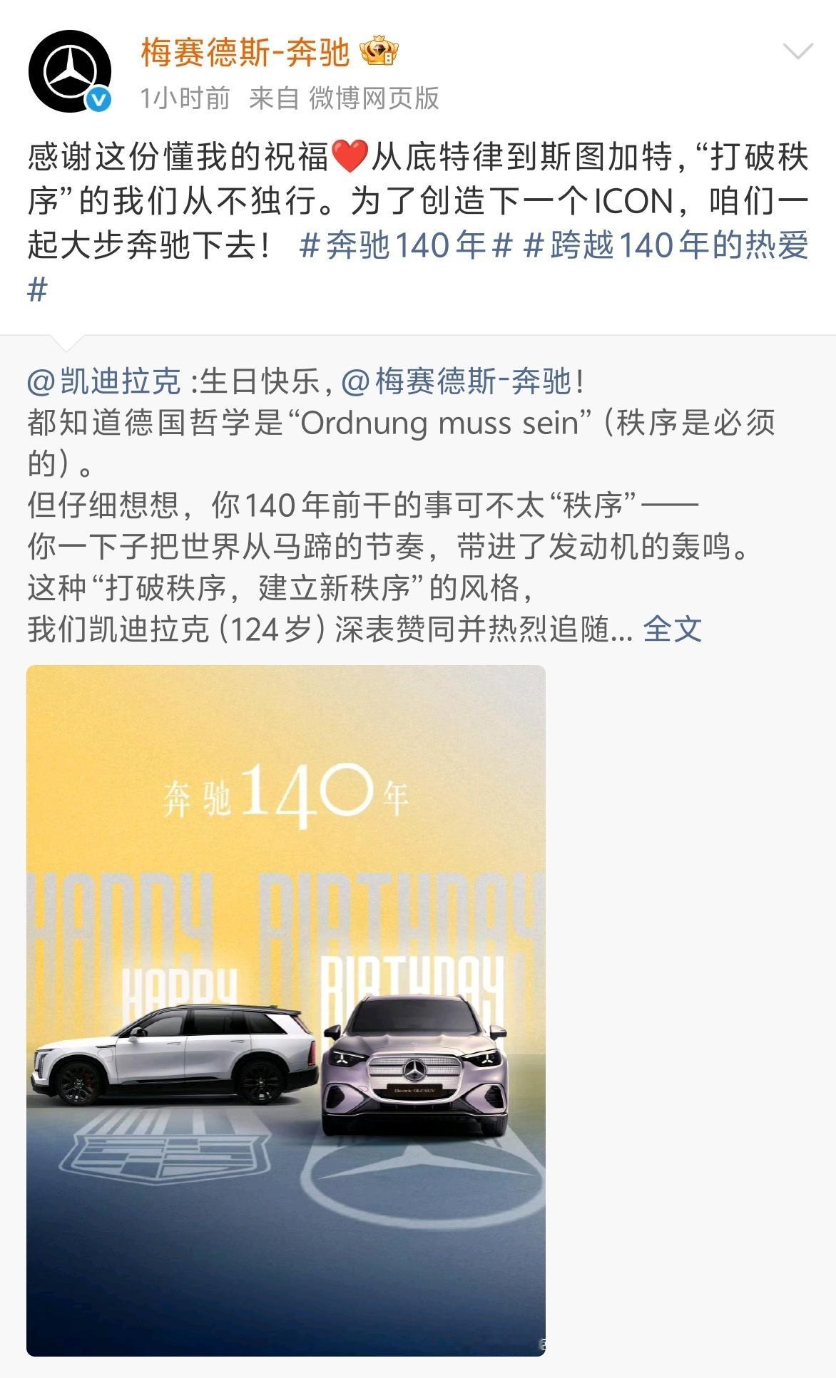 今天是奔驰140岁生日,多家车企都送上了祝福,其中不乏有相爱相杀的老对手奥迪,也有初出茅庐的新车企小米。奔驰140年说真的,汽车行业哪有永远的“全面赢家”啊,一定是你追我赶的市场竞争。要不然,可能今天我们还要纠结,到底加不加钱选装收音机。竞争不是非得你死我活,我们作为消费者其实挺受益的。大家都陪着奔驰吹蜡烛,这个老牌巨头之所以是行业标杆,不光因为发动机参数,更因为它见证了整个汽车文明怎么在较劲中螺旋上升。强者总是惺惺相惜,车企们互相祝福,不妨理解成一种特殊的浪漫——毕竟没有值得尊敬的对手,哪来不断超越的我们啊?跨越140年的热爱