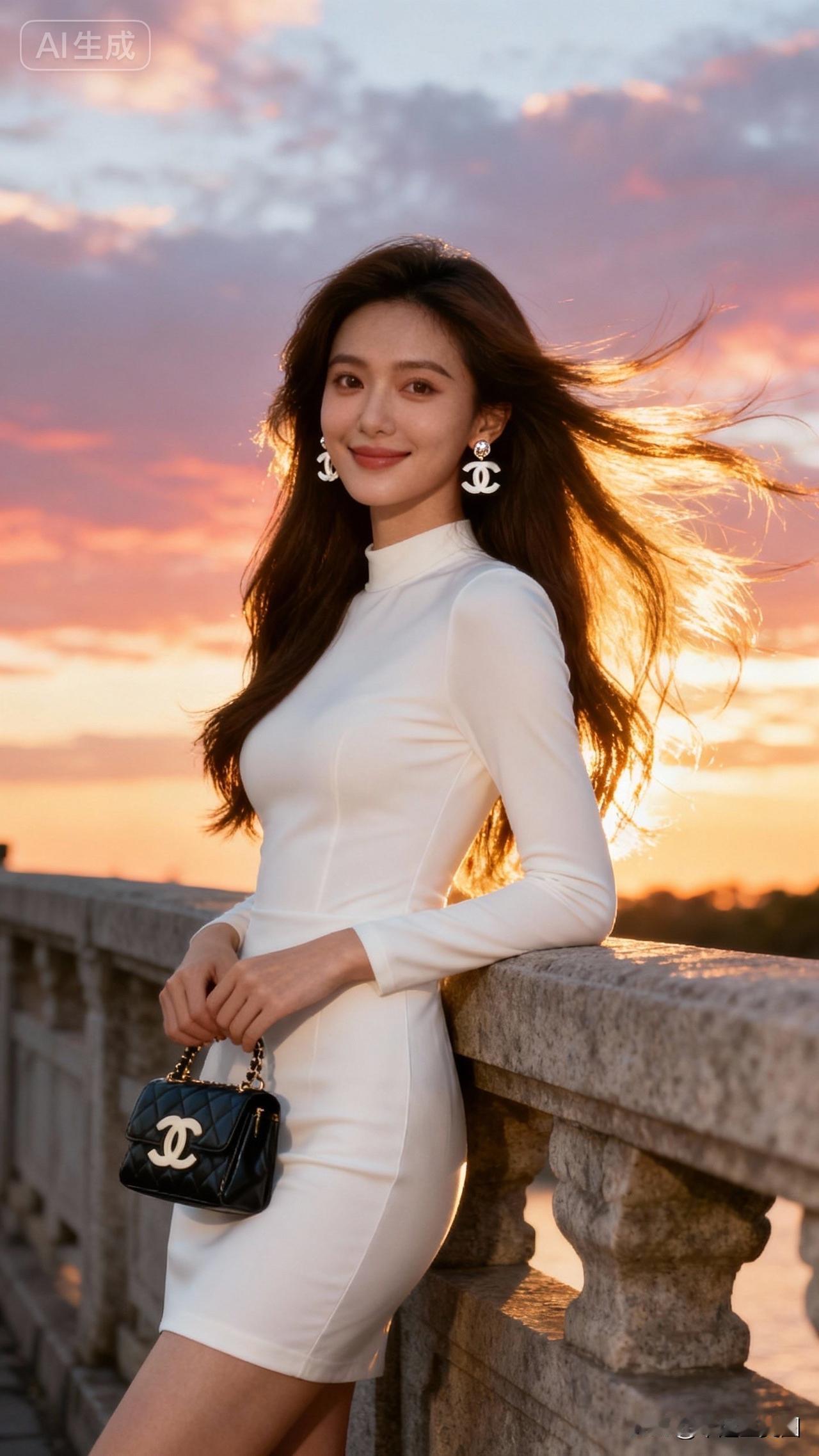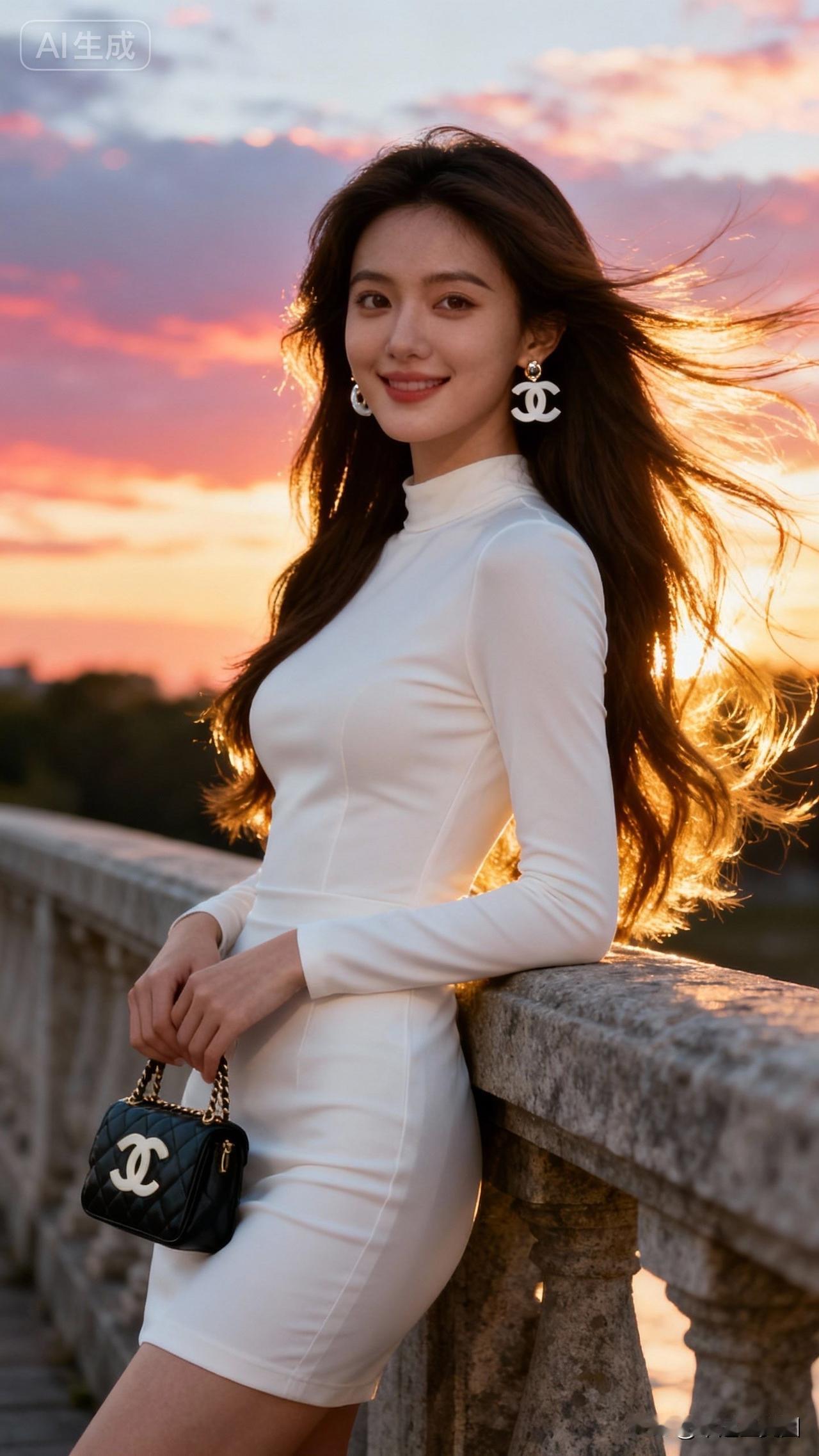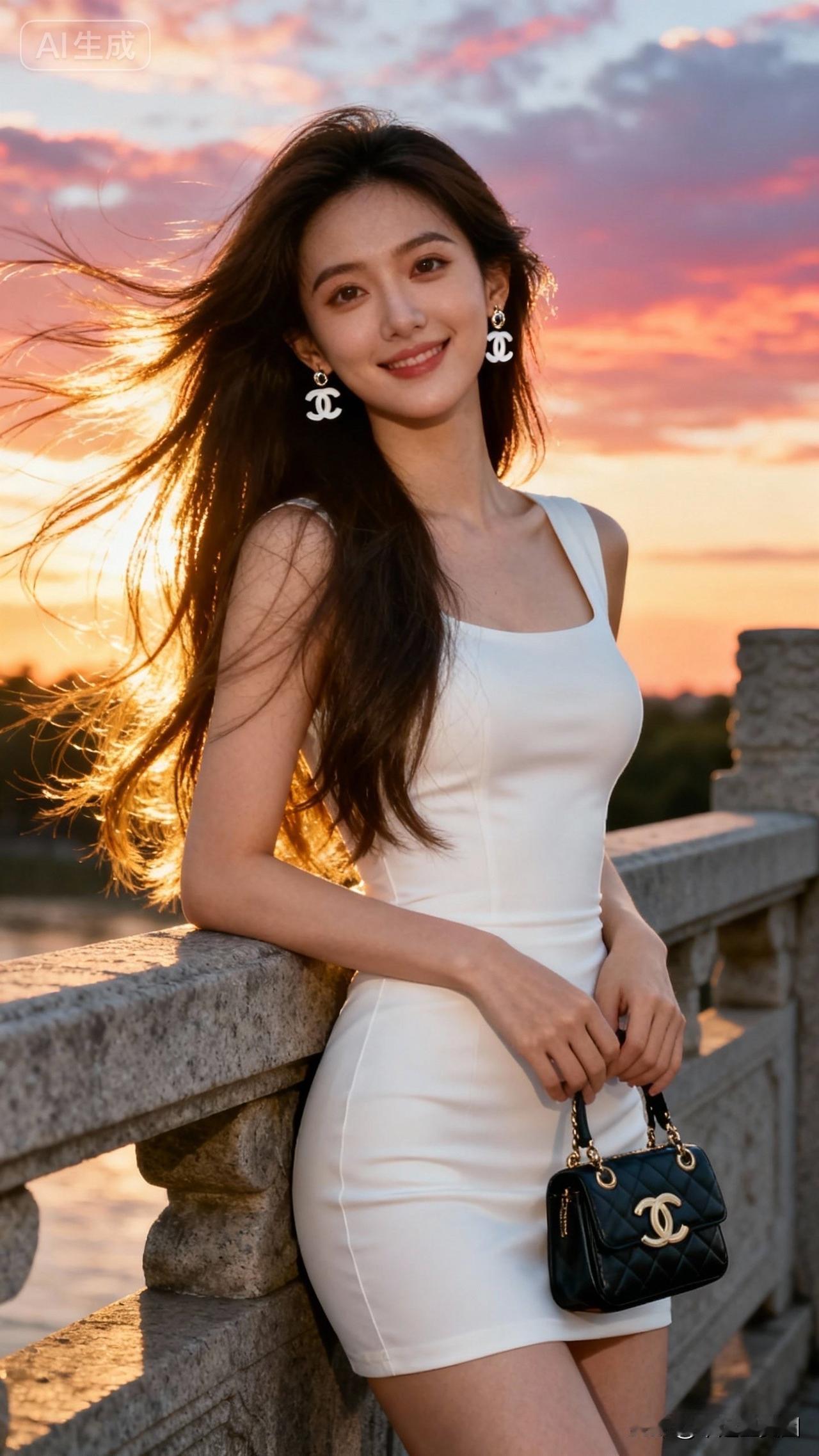 夕阳下的优雅白裙,时尚与自然完美融合🌅👗💄