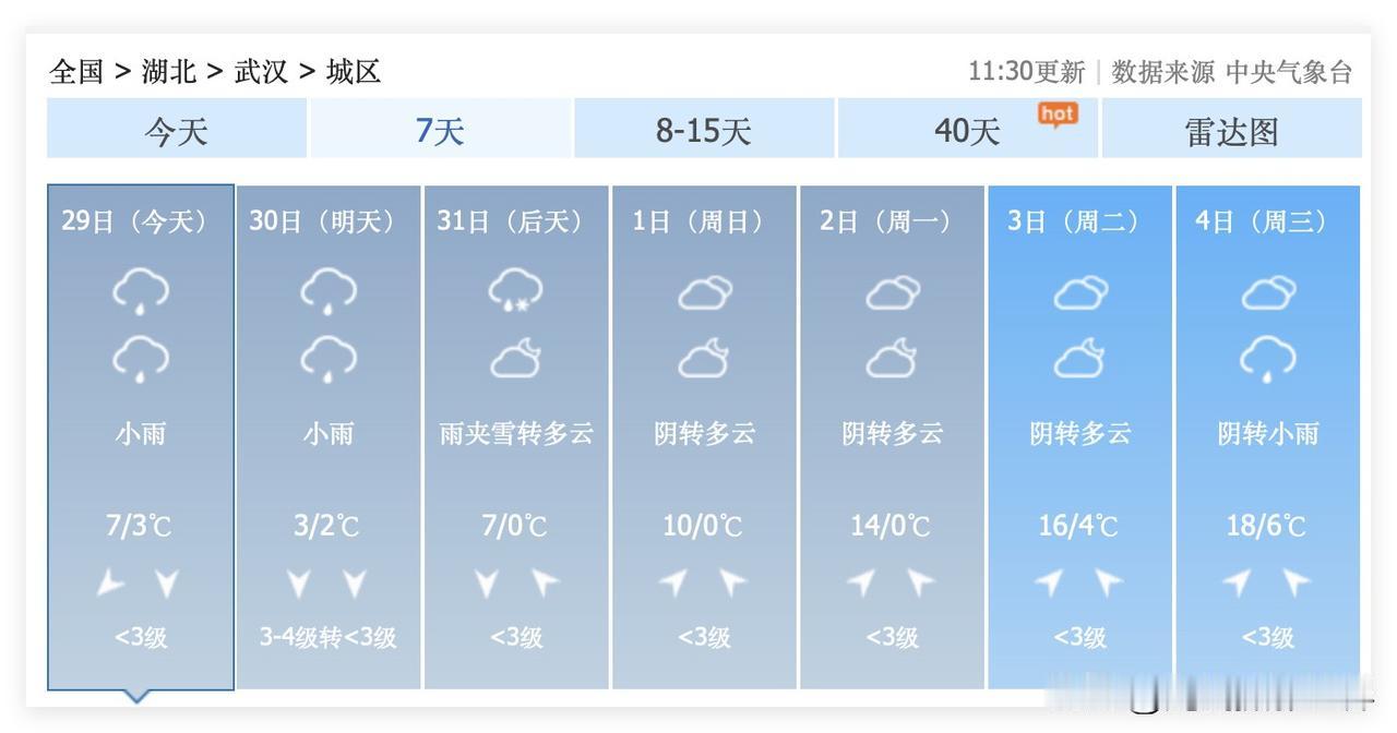 虽然湖北省武汉市,即将雨夹雪!1月29日到31日,武汉市,可能会迎来今年冬天最后的疯狂!2月1日到6日,武汉市快速回暖,最高气温18度……2月11日到12日,武汉最高气温20度…… 总体来说,2月12日以后的天气预报虽然没有出来,但是,2月中下旬的武汉市,大家觉得通常会是什么样的呢?! 马上就要立春啦! 春天的脚步越来越近了! 看样子,1月29日到31日的这种非常难熬的阴冷潮湿的湿冷寒冬,可能是今年冬天最后的疯狂啦! 扛过这波寒潮,熬过这波降温……2月1日以后……武汉人,就要逐渐迎来春天啦! 太棒了!