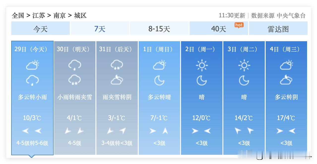 扛过1月30日和31日的南京雨夹雪、大降温之后,2月1日,南京出大太阳,气温快速回暖!南京市,最最难熬的冬天,可能很快就要结束啦! 2月1日到5日,南京市,最高气温17度,非常温暖! 2月11日到12日,南京市,最高气温冲刺24度! 再然后,2月中下旬……大家觉得,还会有那么持续的冻死人的雨夹雪天气吧?! 不是说不会有,而是说,可能性,概率,就会很低啦! 春天的角度,真的越来越近啦! 好吧,1月底最后2天,南京市雨夹雪,超级冻人的寒潮,可能是这个冬天最后的疯狂啦!