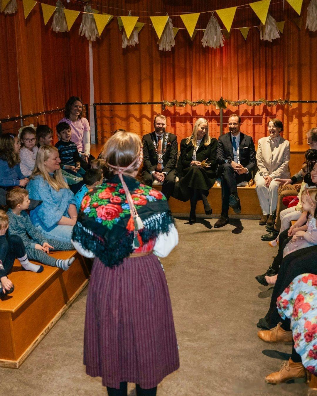 新闻 2026.1.28 挪威王储夫妇出席弗雷德里克斯塔德图书馆建成开放100周年纪念活动,梅特的内搭波点上衣来自Greta,黑色半裙来自Andiata。