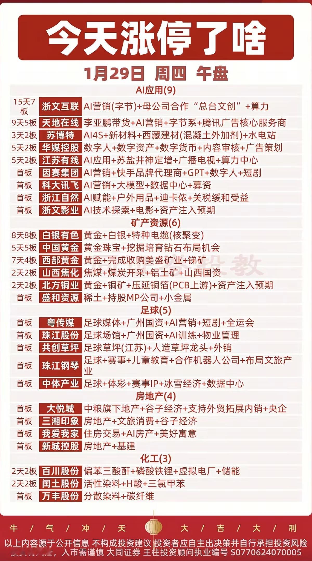 1.29周四 涨停板股票:题材+明细+分布 人工智能AI应用 9股涨停 矿产资源 6股涨停 足球体育 5股涨停 房地产板块 4股涨停 化工原料 3股涨停