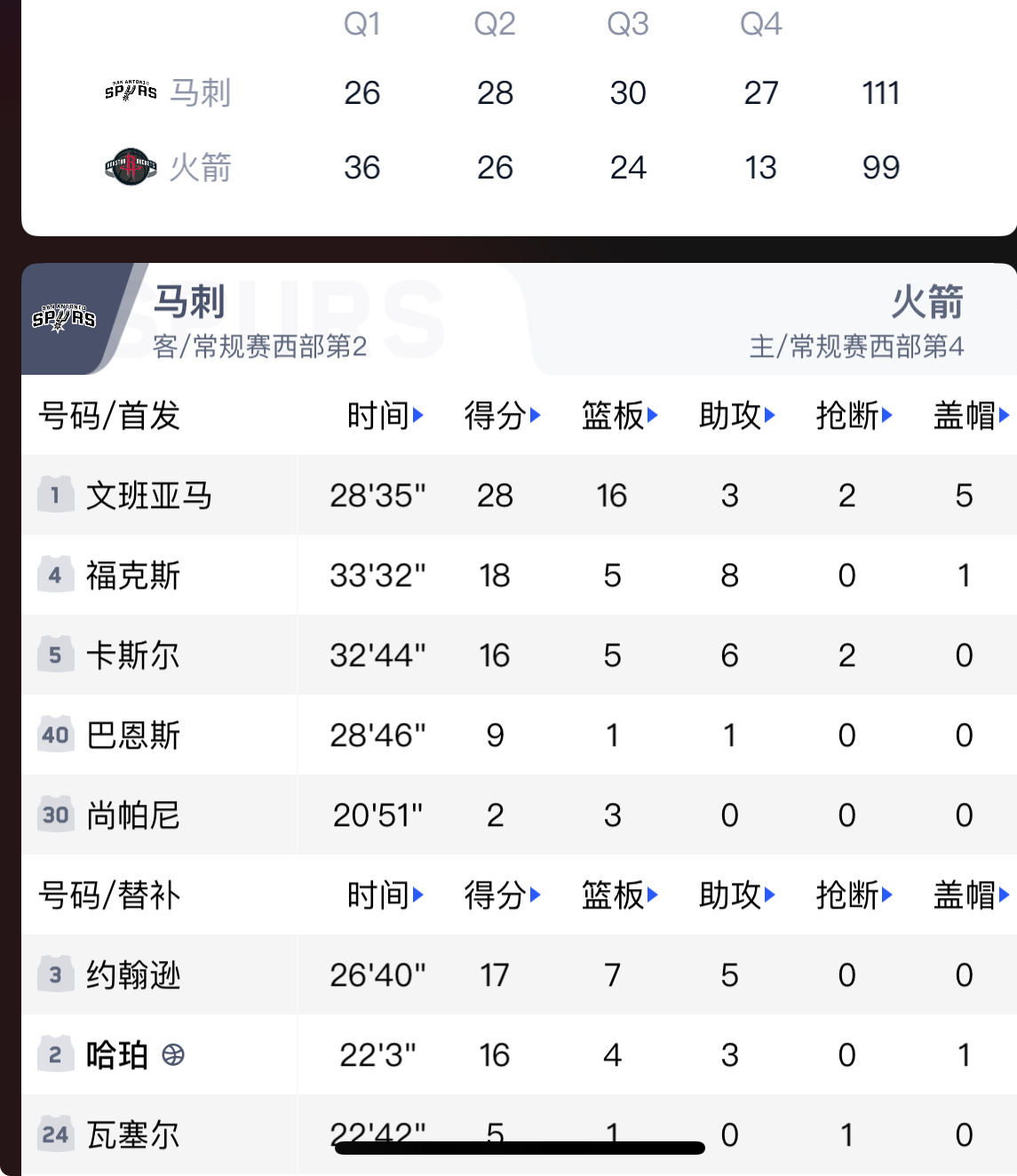28+16+5帽统治攻防!文班亚马一人打崩火箭马刺111-99逆转火箭,这球看完