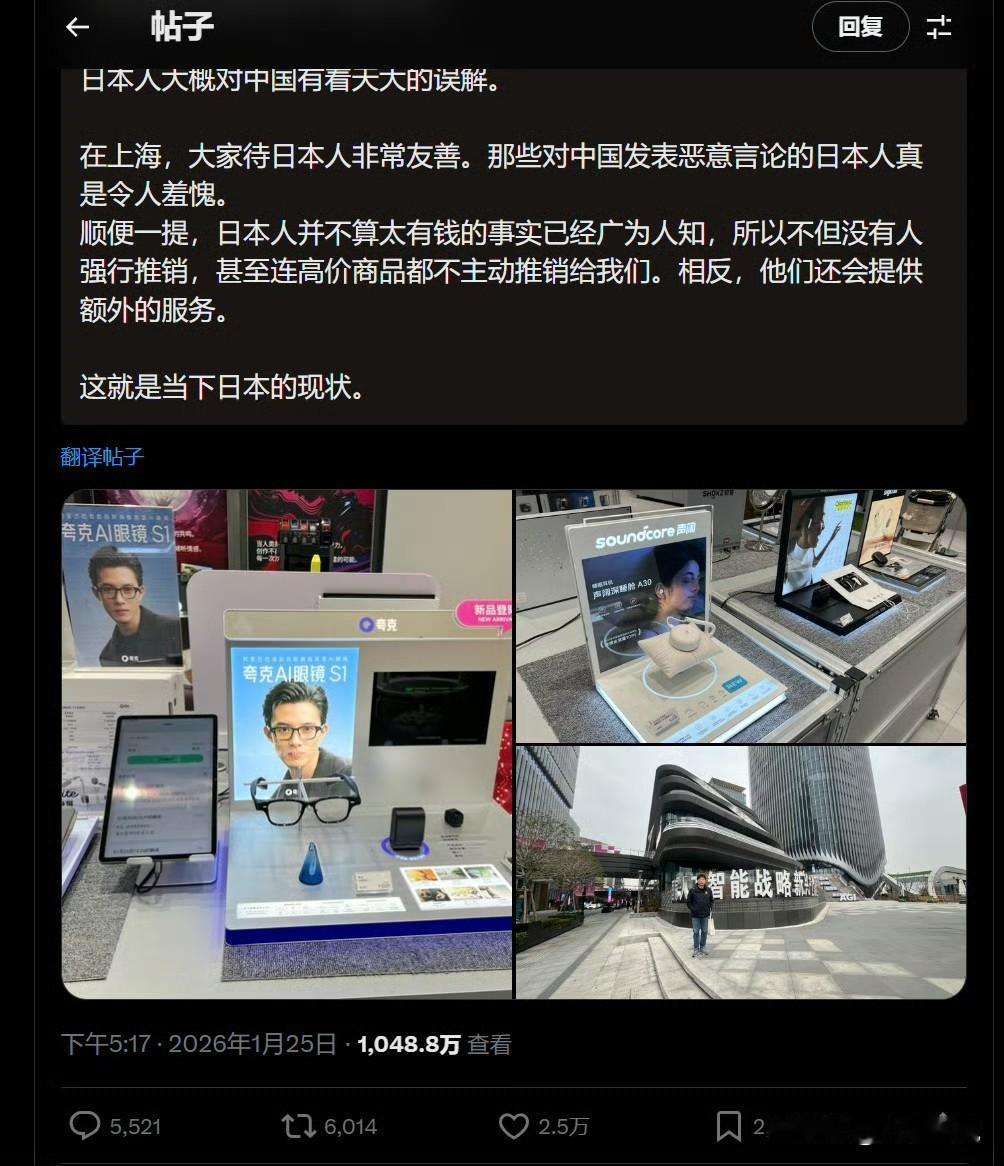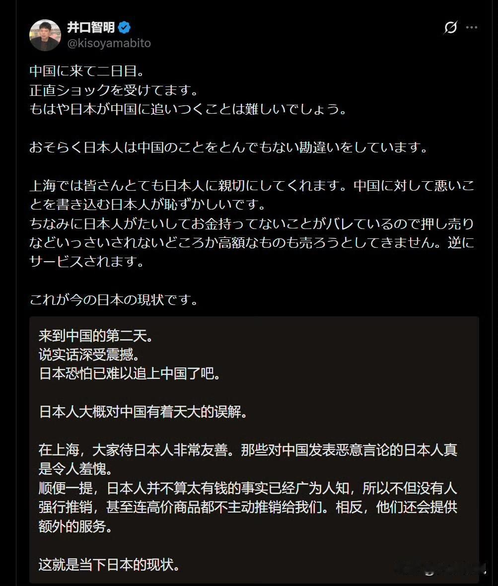 日本人来上海后大受震撼,承认对中国有天大的误解,表示追上中国已经很难。有日本人发帖自己到中国后大受震撼,与自己在日本听到的有巨大差异,他发现中国人对日本人很友好,并不像在日本听到的那样,中国人都很仇视日本人。并且表示日本也不要再有那种高高在上的心理了,因为日本人现在并不算有钱,中国也没有专门针对日本人推销产品,但却提供不错的服务。