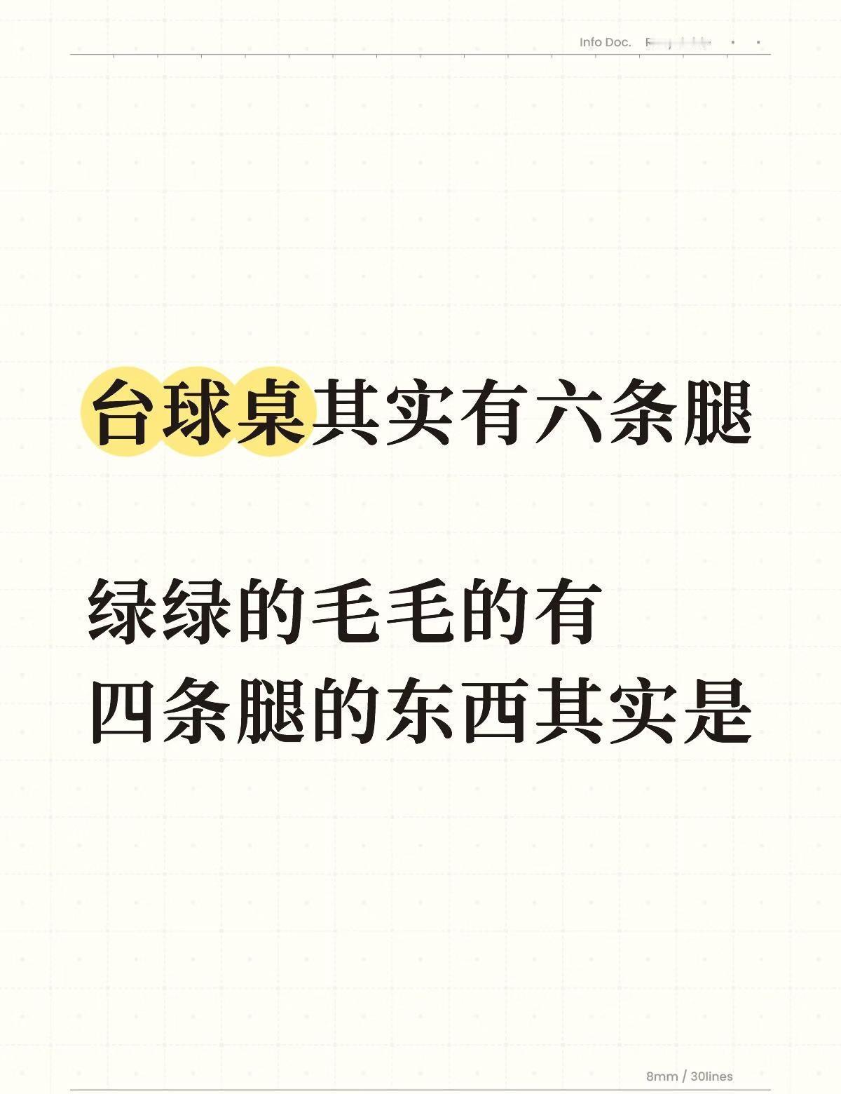一件细思极恐的事 三分之二张台球桌。 一直在笑台球桌笑话某天突然发现台球桌其实有六条腿,并且甚至市面上比较热门的牌子,个很多比赛都是六条腿,但很少在评论区看到别人说这个于是迷思…… 有趣的事实 让人惊讶的事情