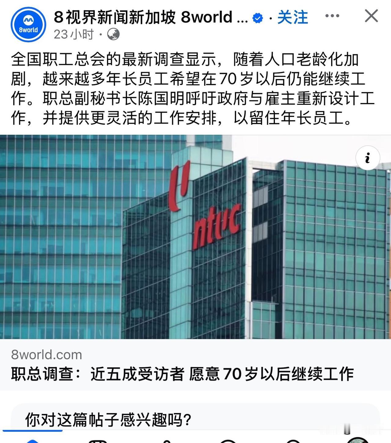 新加坡某新闻媒体报道,调查显示越来越多的年长的员工希望七十岁后还能继续工作。如果,在中国,我相信再没钱,也不想这么大年纪工作吧?这个年纪,想工作,身体健康条件已经不允许了,子女也不会让的。