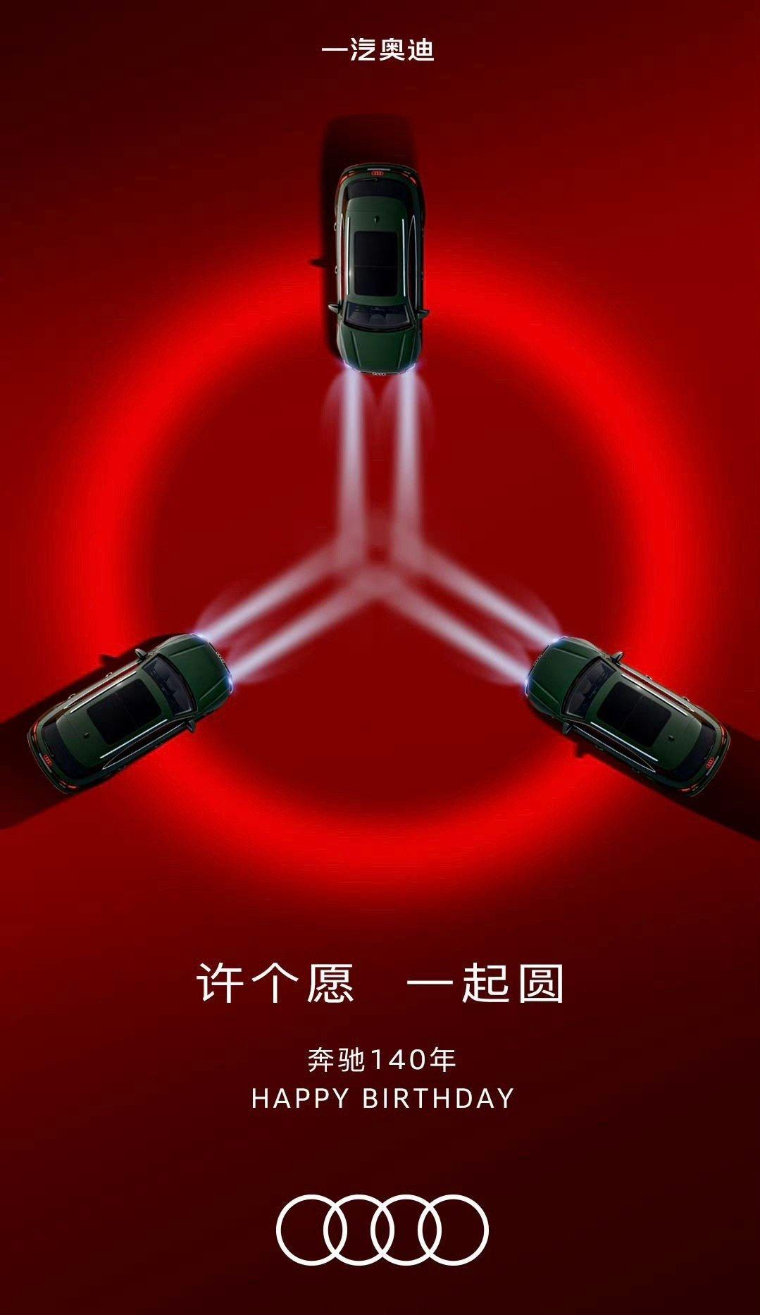 奔驰140岁生日,哪家祝福最有创意? 1月29日是奔驰140岁生日,也是汽车工业的140年 886年1月29日,卡尔·本茨为他的三轮专利机动车“奔驰一号”提交了专利申请——这一天,被全世界公认为汽车的诞生日! 所以今天也能看到很多车企都用超有创意的互动方式致敬奔驰,你觉得哪家的海报最有创意?(BBA目前还少一个)